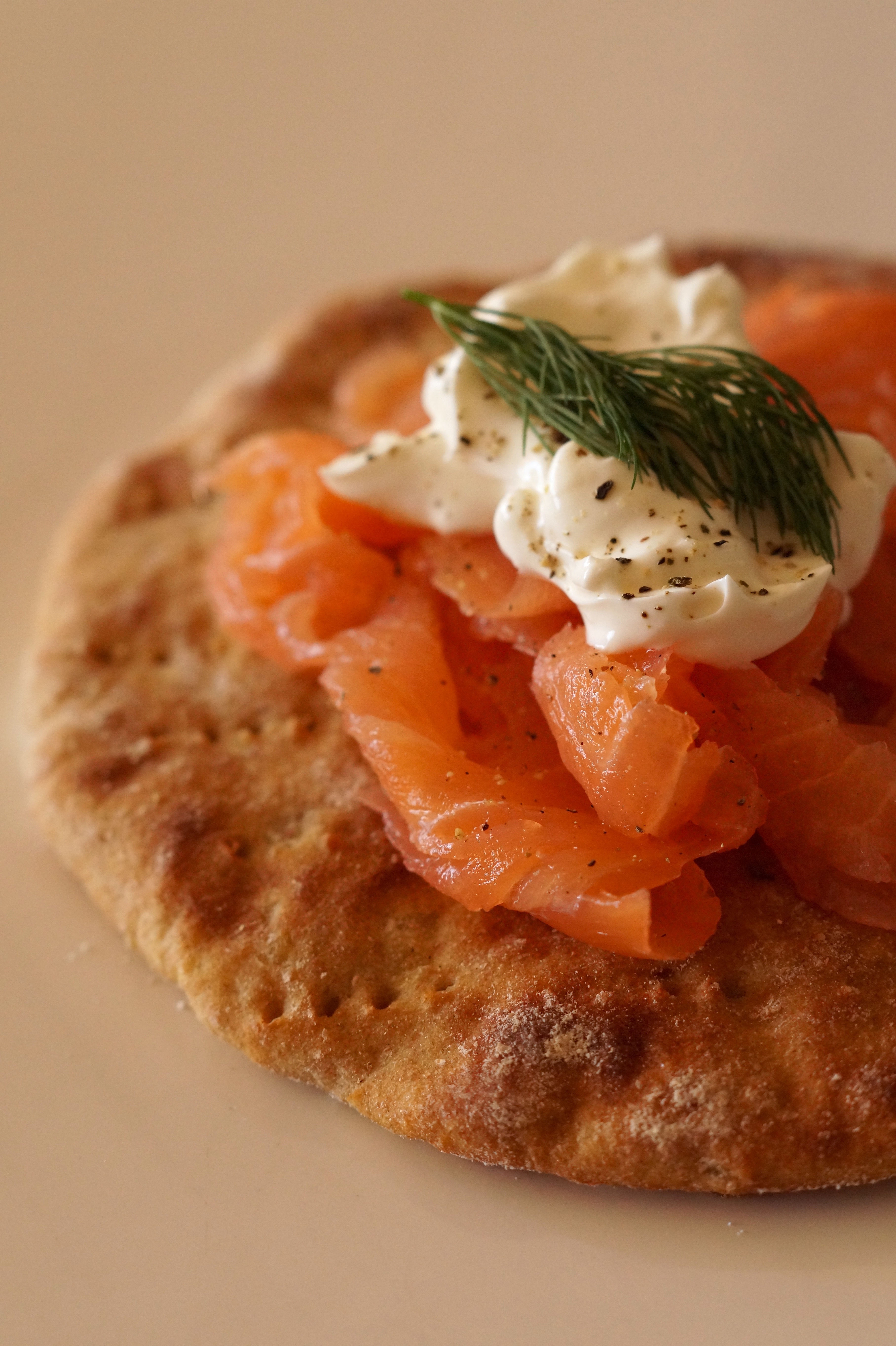 Zalm en dille is eigenlijk altijd goed. Maakt niet uit waarop je het serveert. Hoewel ik het eigenlijk heel vaak gewoon zo eet. Zonder iets ‘eronder’.