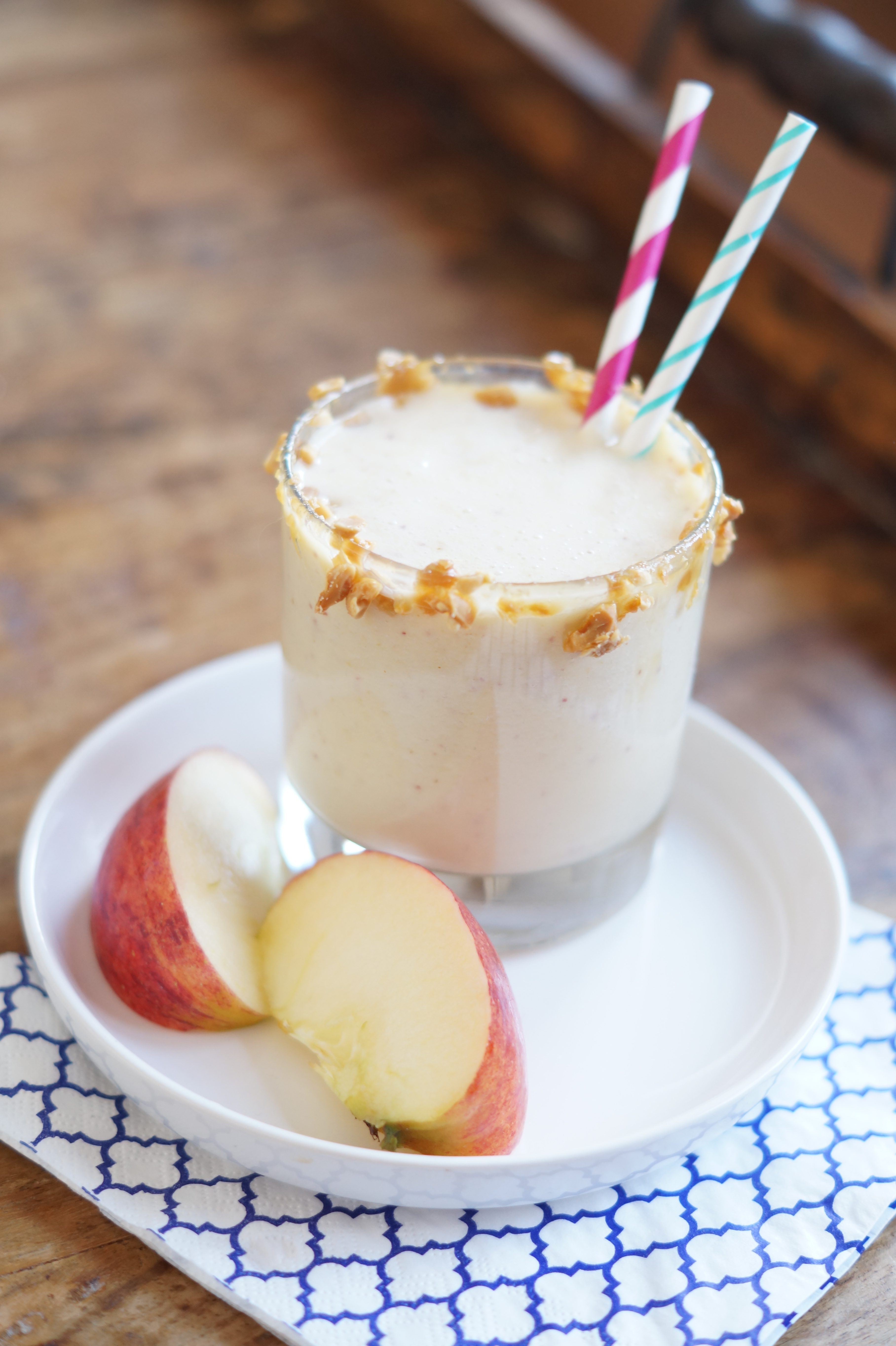 1. In de kom van je blender doe je de melk, appelsap, appel en  een eetlepel caramelsaus. Mix tot het een vloeibaar geheel is.