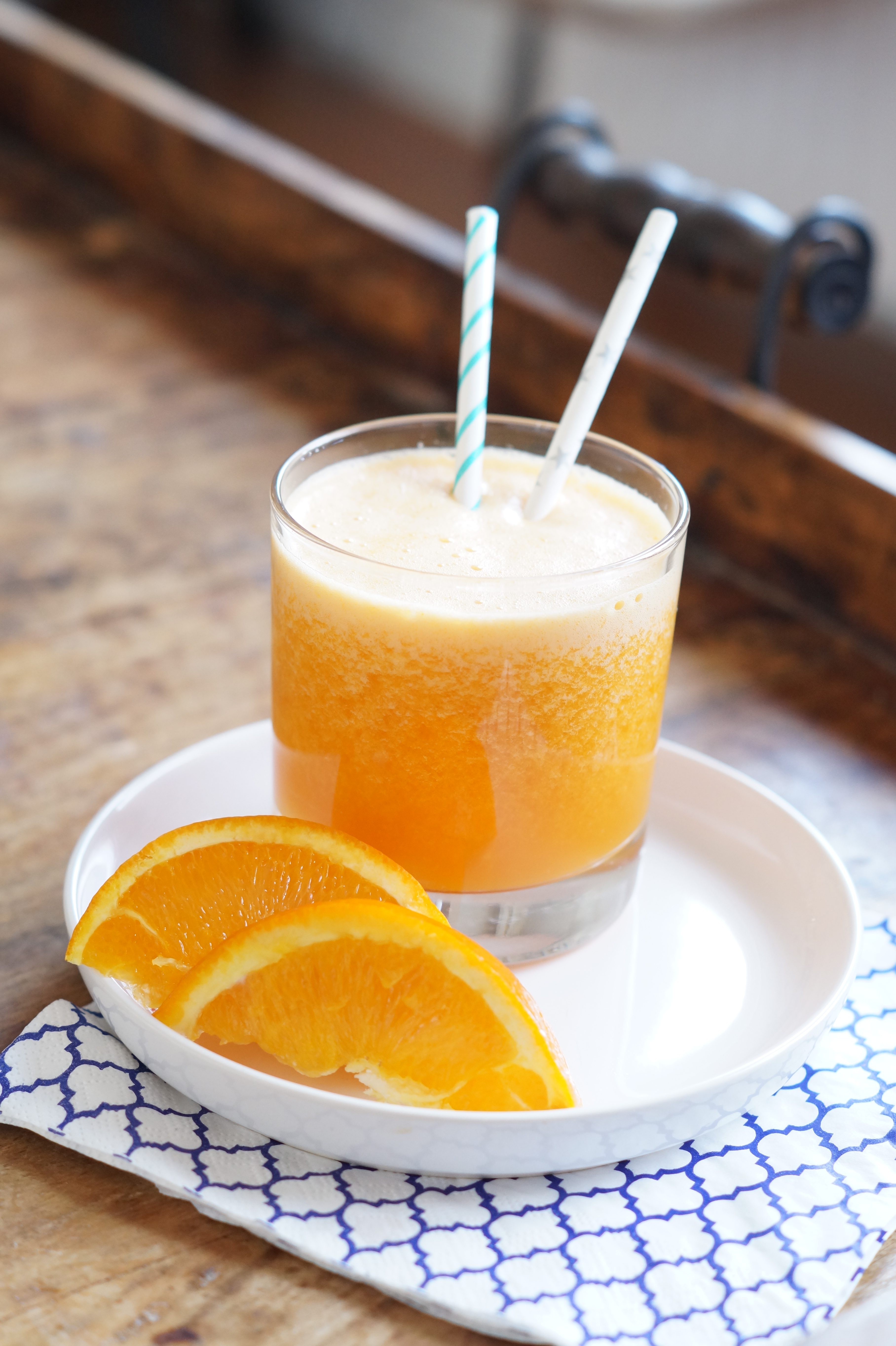1. In de kom van je blender doe je het sinaasappelsap, de sinaasappel, wortel, gember en kurkuma. Mix tot het een vloeibaar geheel is.