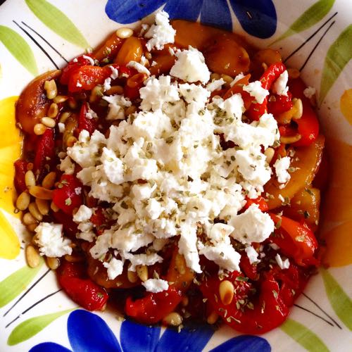 Filed Under: Erbij, Salade Tagged With: balsamico, feta, gegrilde paprika, geroosterde paprika, olijfolie, pijnboompitten