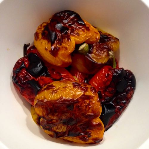 Je kan de paprika’s op verschillende manieren grillen. Een manier is door de paprika op een brandend gaspit op je gasfornuis te leggen en af en toe om te draaien. De paprika’s moeten goed zwart geblakerd worden. Je kan ze ook, zo doe ik het, halveren en met de bolle kant naar boven op een bakplaat leggen. Bekleed die eerst met aluminiumfolie, scheelt schoonmaken. Zet de bakplaat onder de grill en laat ze daar zwart worden.