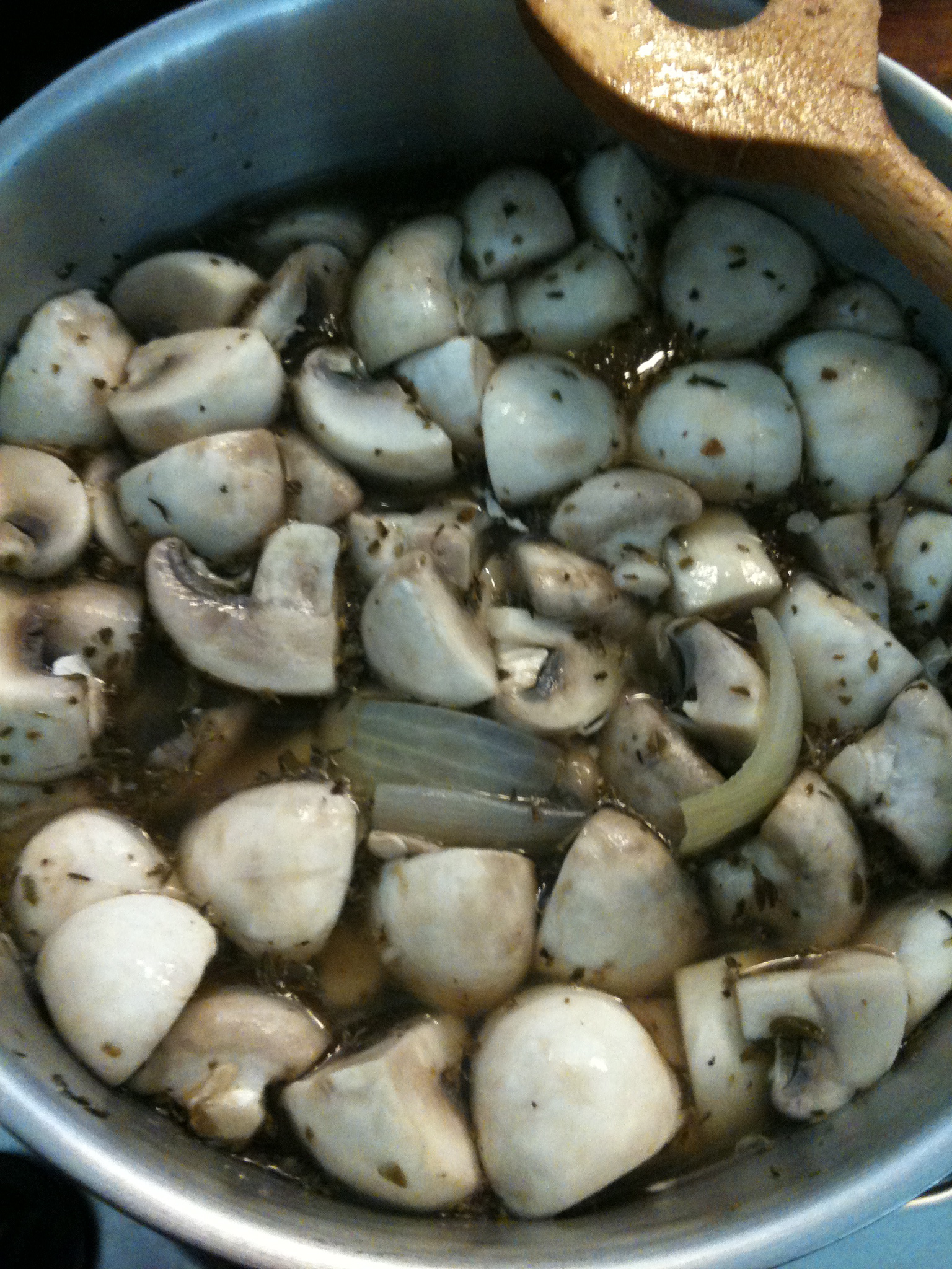 Giet de  champignons af (bewaar eventueel het vocht voor een soepje) restjes van kruiden en laurier mogen weg.