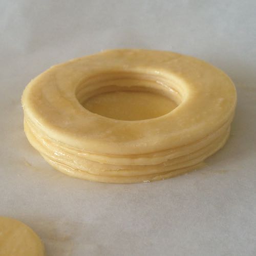 Leg de 2 bodemrondjes op een met bakpapier bekleedde bakplaat en besmeer de rand met geklutst ei. Leg daarop een ring bladerdeeg en bestrijk ook die met ei. Herhaal tot je in totaal 5 laagjes per bakje hebt. Bestrijk de bovenkant ook met ei.