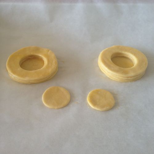 Leg de 4 plakjes bladerdeeg iets overlappend in een vierkant. Druk de naden goed aan. Rol het met een deegroller wat dunner uit en zorg dat je 10 rondjes van 7 cm uit kan steken.Hou 2 rondjes apart, dat zijn de bodems. Van de resterende 8 plakjes steekje met de 4 cm steker het midden uit. Ook hiervan hou je 2 plakjes apart. Dat worden de dekseltjes.
