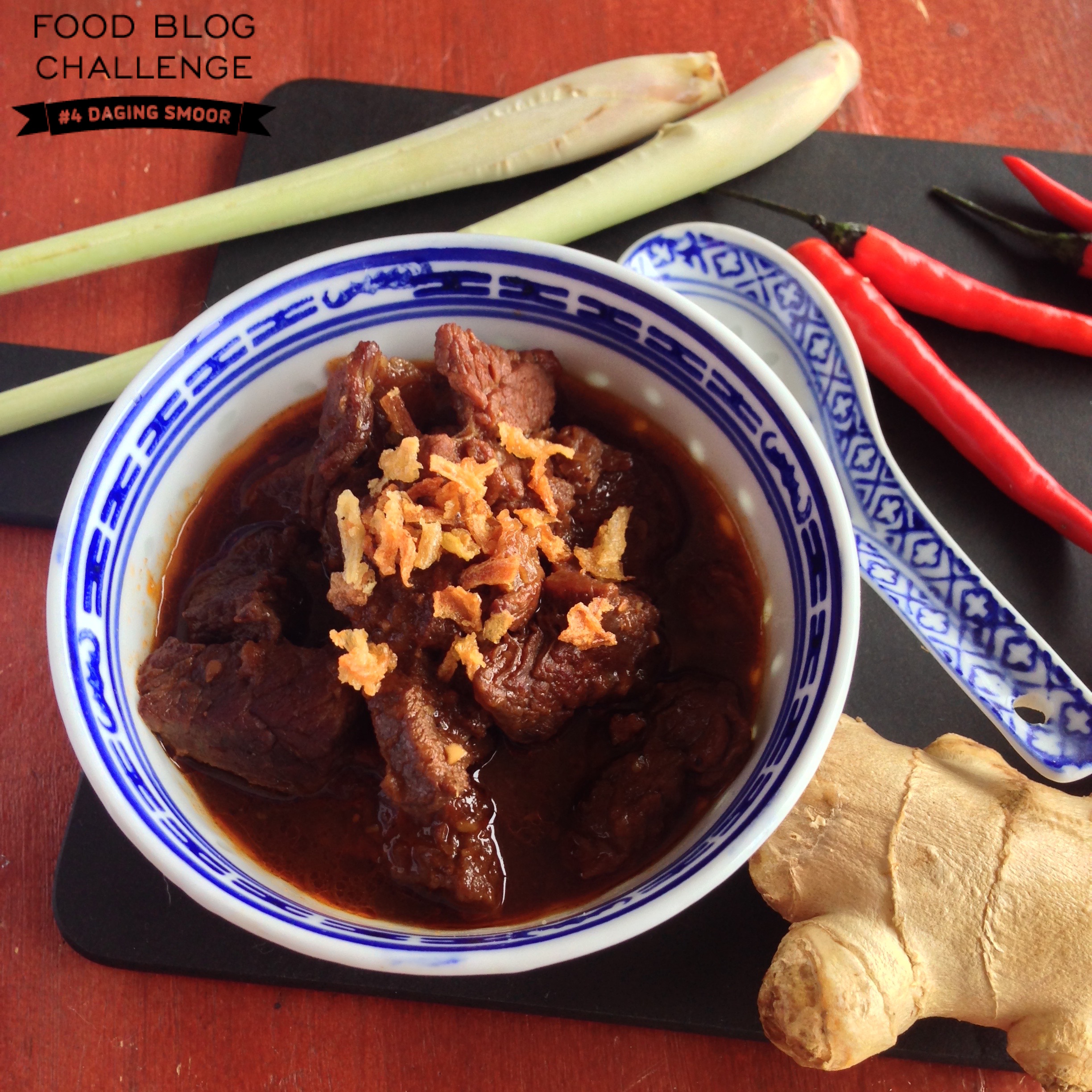 De nieuwste challenge was daging smoor. Hartstikke lekker natuurlijk maar zo’n bruinige vleesmaaltijd maakt niet altijd de meest aantrekkelijke foto’s. Ik heb mijn best gedaan om het enigszins een beetje smaakvol eruit te laten zien. Nou ja, als je al eens daging smoor hebt gegeten weet je gewoon dat hoe het er ook uit ziet, het smaakt ontzettend lekker.