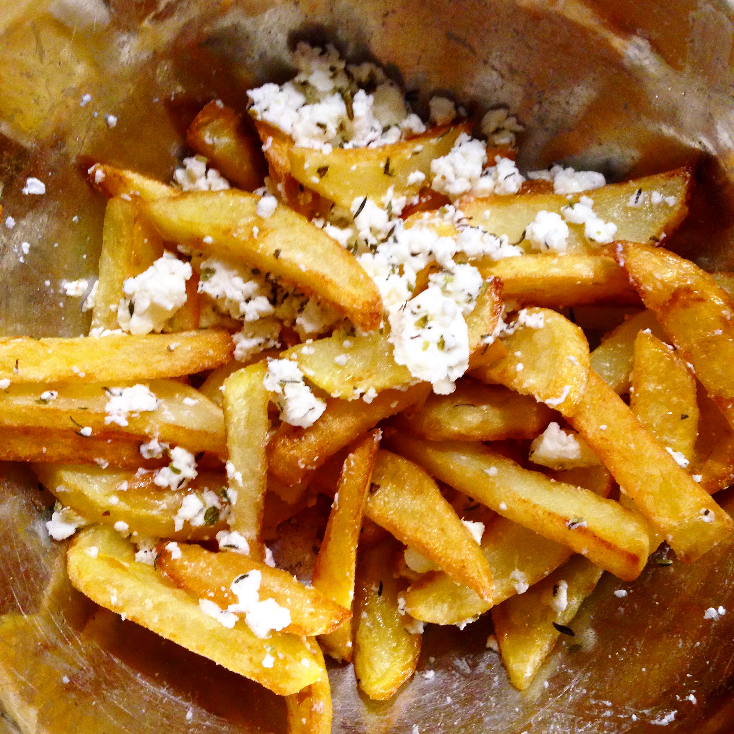 Bak de frietjes volgens voorschrift op de verpakking. Schep ze in een schaal en meng met de verkruimelde Feta, kruiden en breng op smaak met zout.