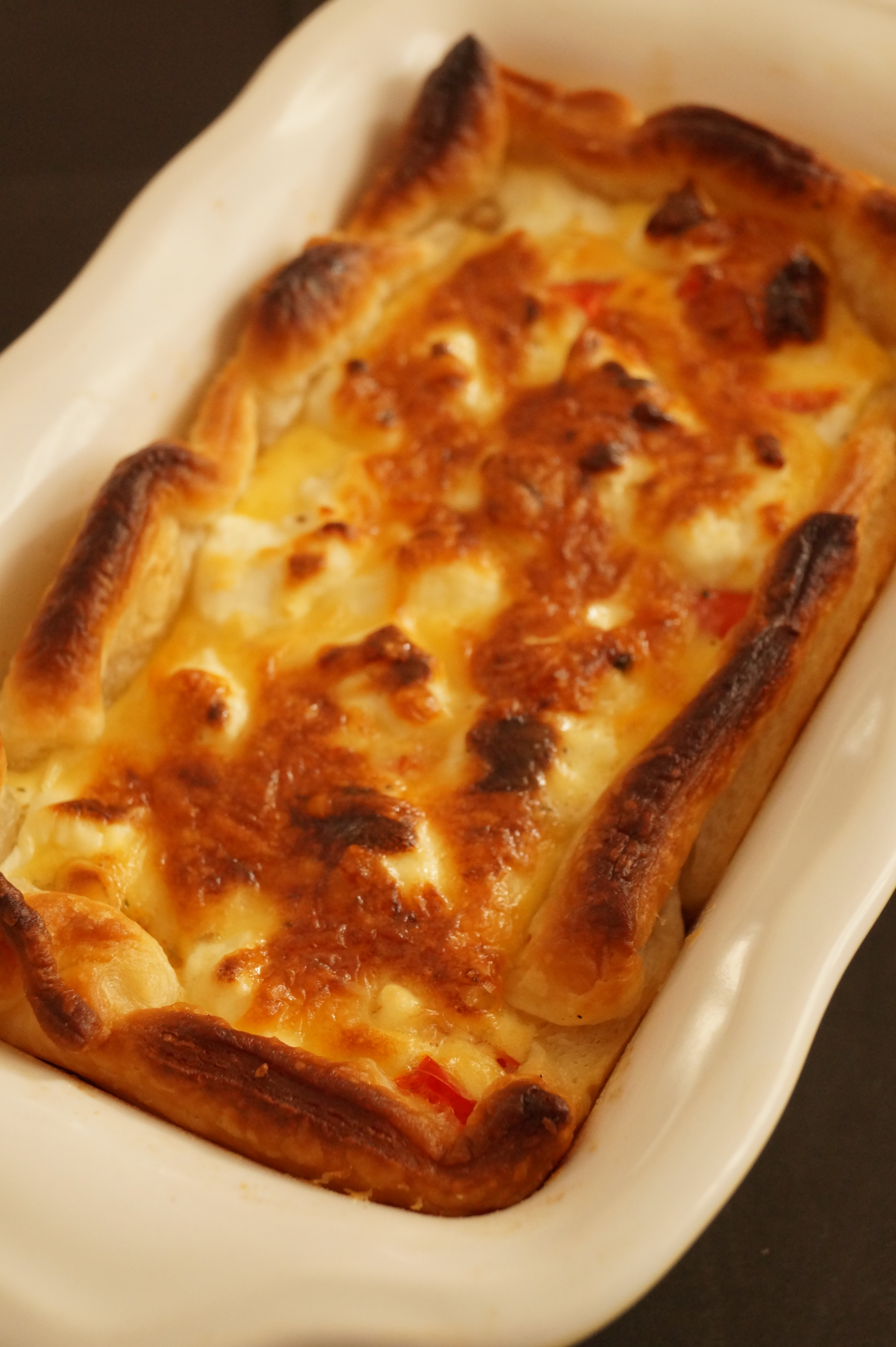 6. Bak in de oven in ongeveer 20 – 25 minuten gaar of totdat de bovenkant mooi goudbruin is en de vulling gestold.