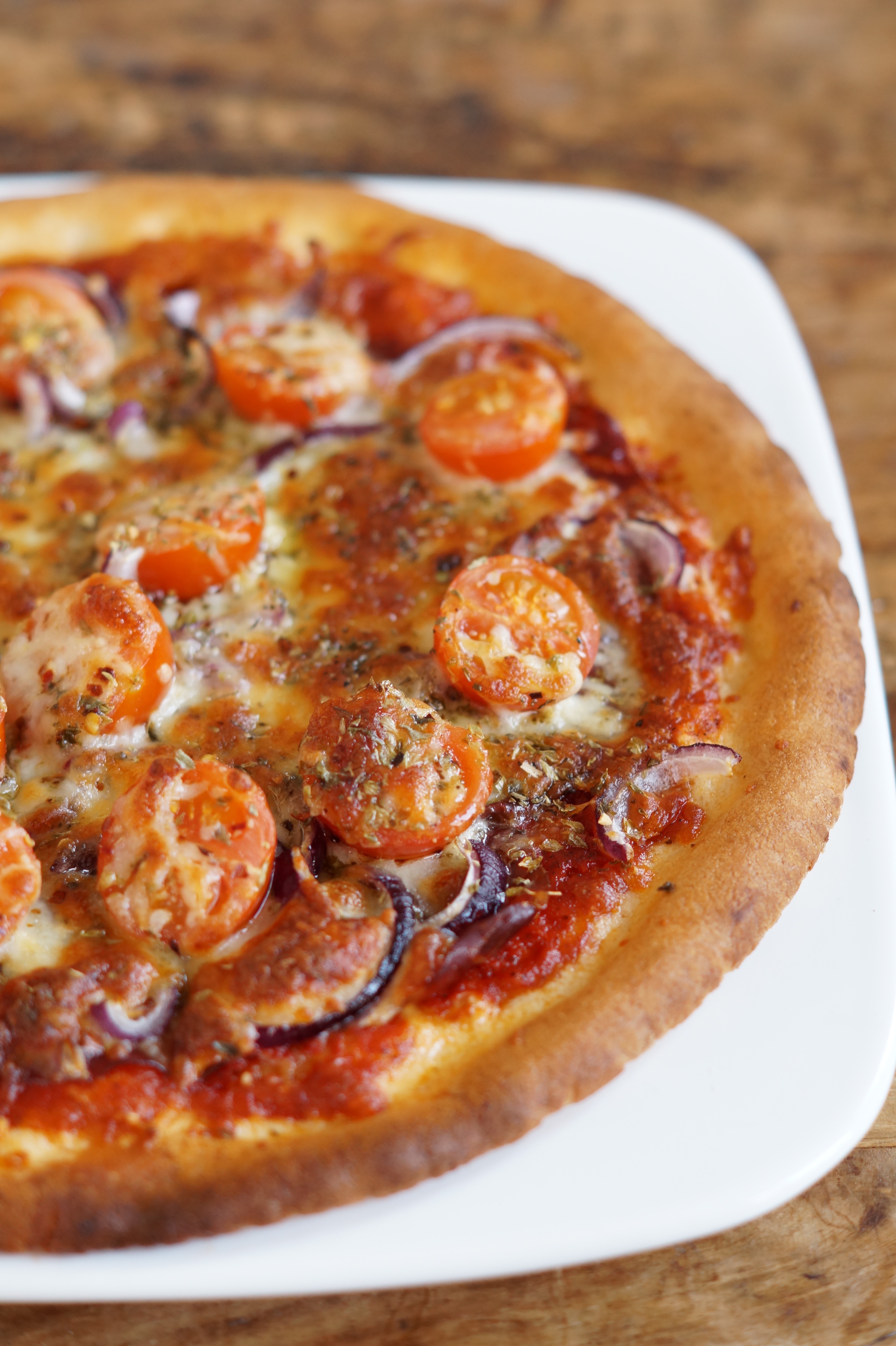 - Beleg de pizzabodem met de plakjes bresaola en verdeel de tomaatjes en rode ui er over.
