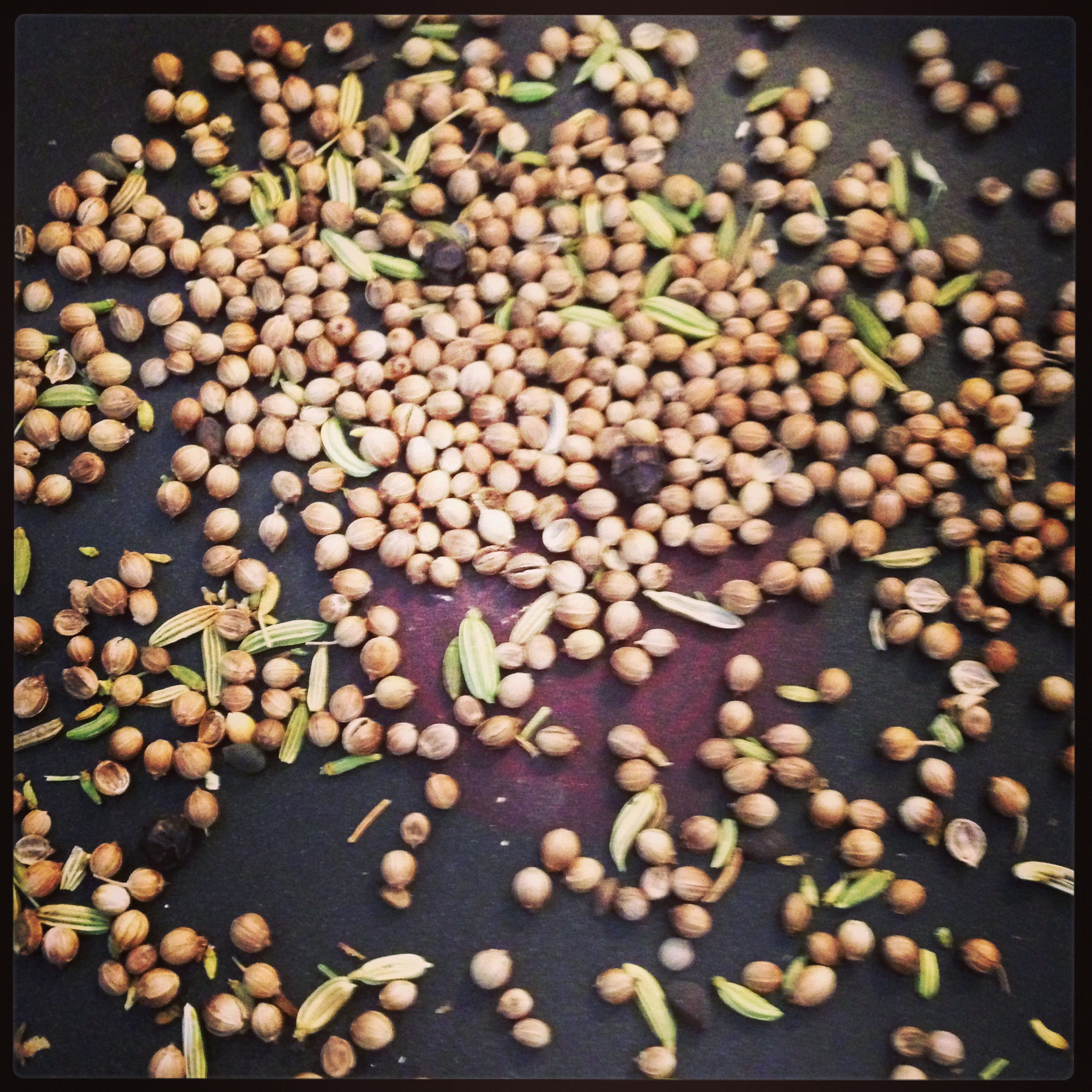 Rooster in een droge pan de korianderzaad, komijnzaad, venkelzaad en de peperkorrels tot ze beginnen te geuren. Blijf de pan bewegen om verbranden te voorkomen. Maal de specerijen daarna in een vijzel of (schone) koffiemolen.