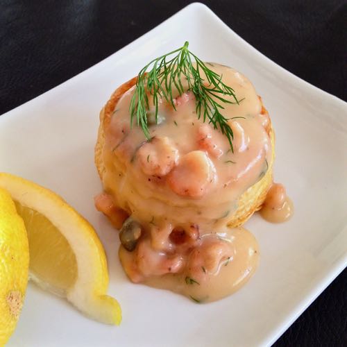 - Verdeel over de pasteibakjes, bestrooi met de rest van de dille en serveer met een schijfje citroen.
