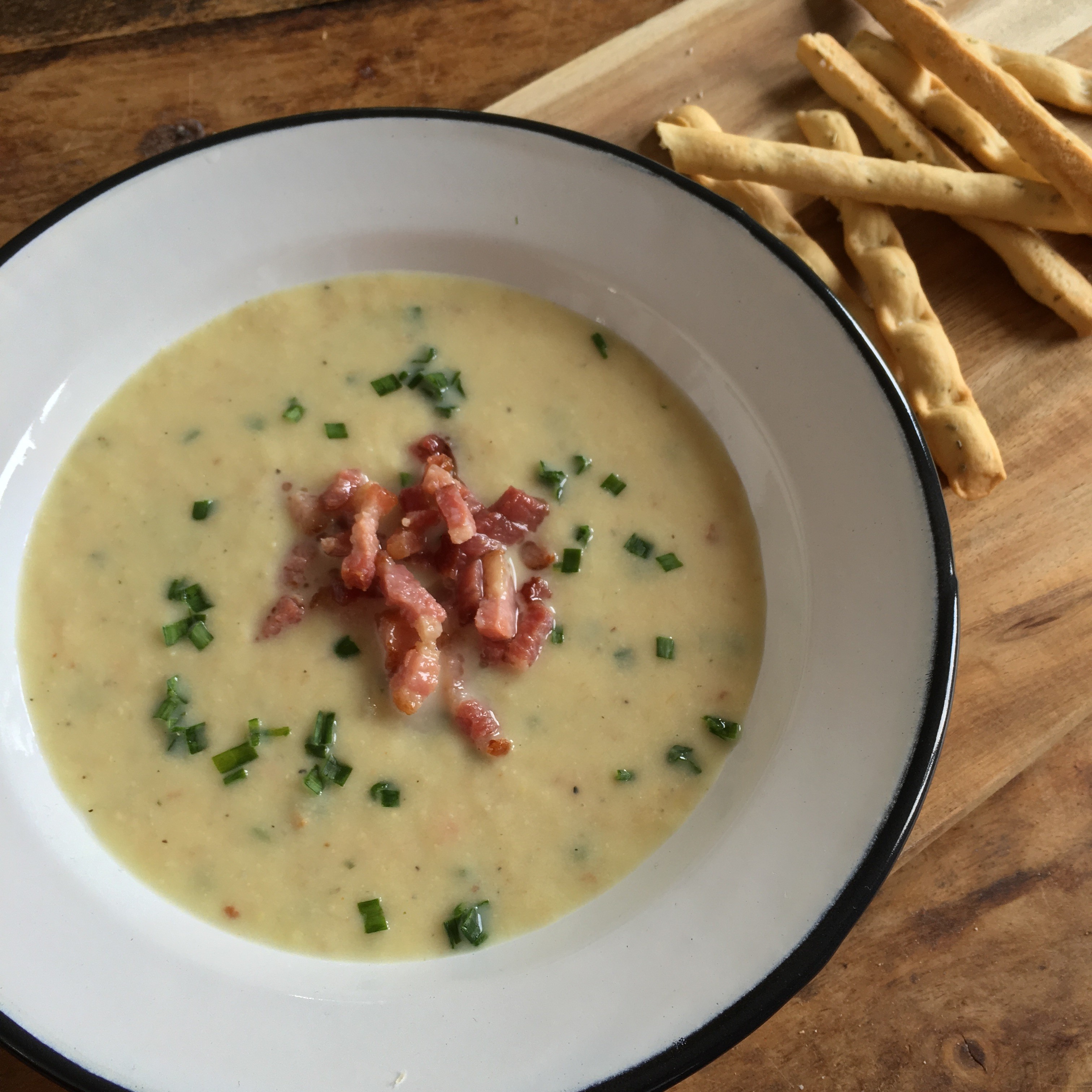 - Verdeel de soep over borden en bestrooi met de achter gehouden spekjes en knoflookbieslook.