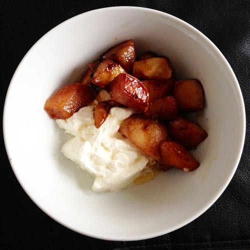 Ik besloot ze op te bakken in roomboter met wat suiker. Een flinke eetlepel Griekse yoghurt erbij en je bent klaar. En het was heerlijk.