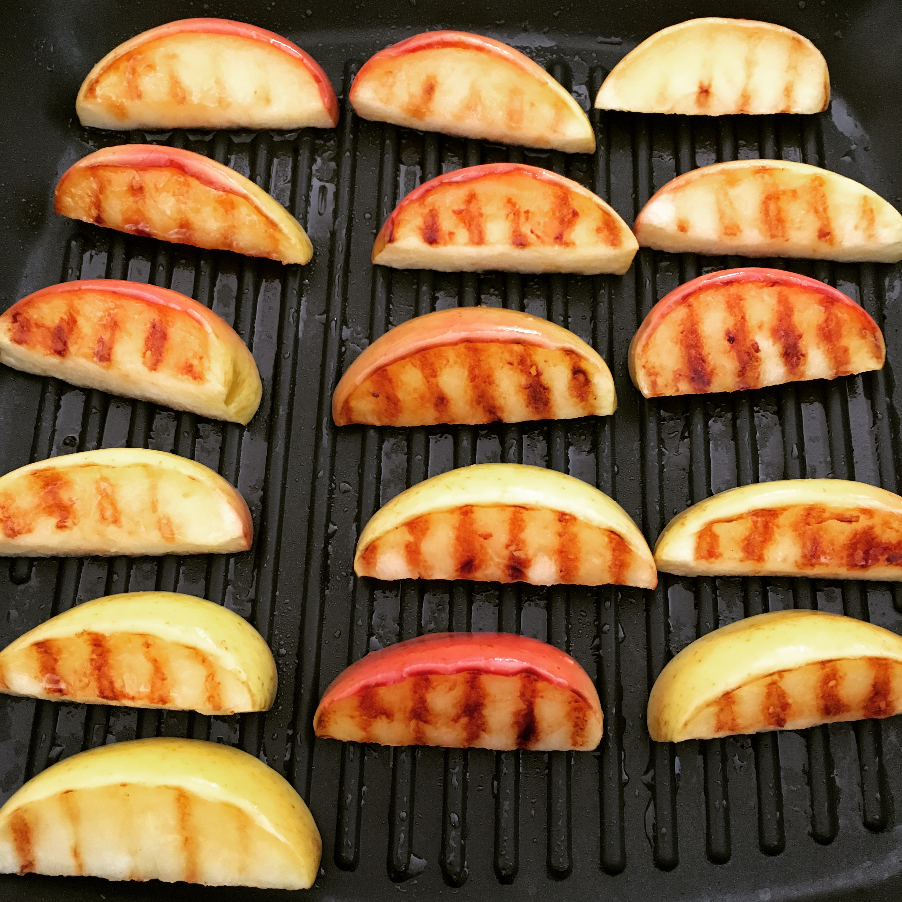 3. Verwarm de grillpan voor. Doe de partjes appel in een schaal of kom en voeg een beetje olie toe zodat alle partjes bedekt zijn met een laagje olie. Bak de partjes in de grillpan ongeveer 4 minuten per kant. Draai regelmatig om