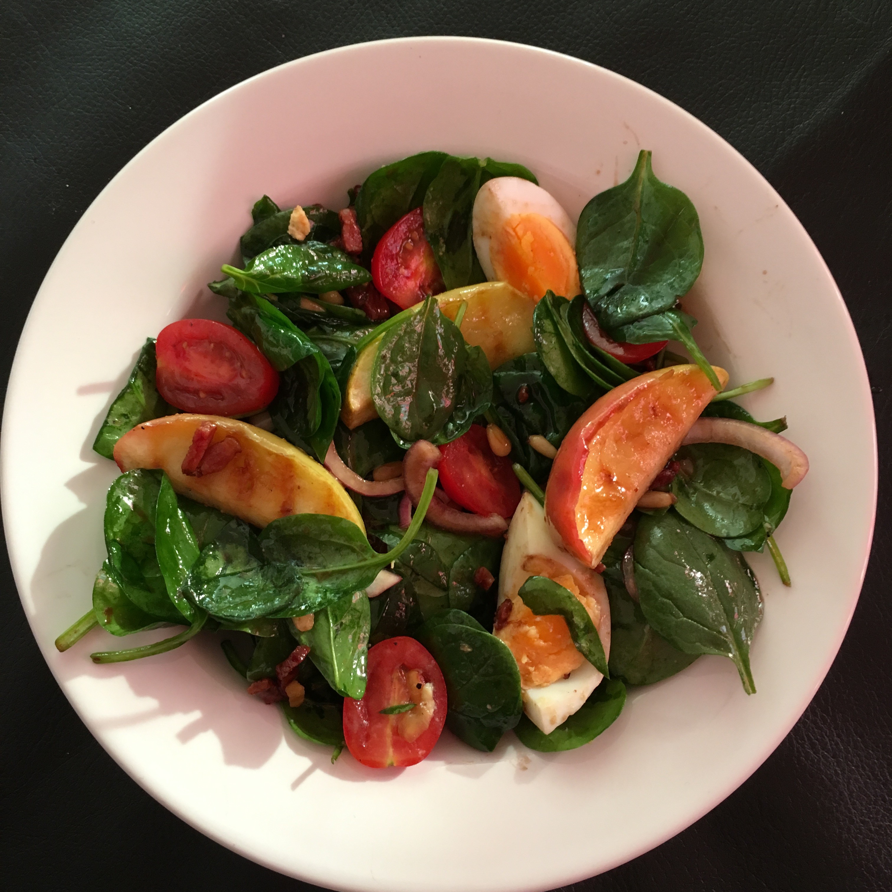 Filed Under: Hoofdgerecht, Salade Tagged With: bacon, balsamico azijn, ei, maaltijdsalade, pijnboompitten, rode ui, salade, spinazie