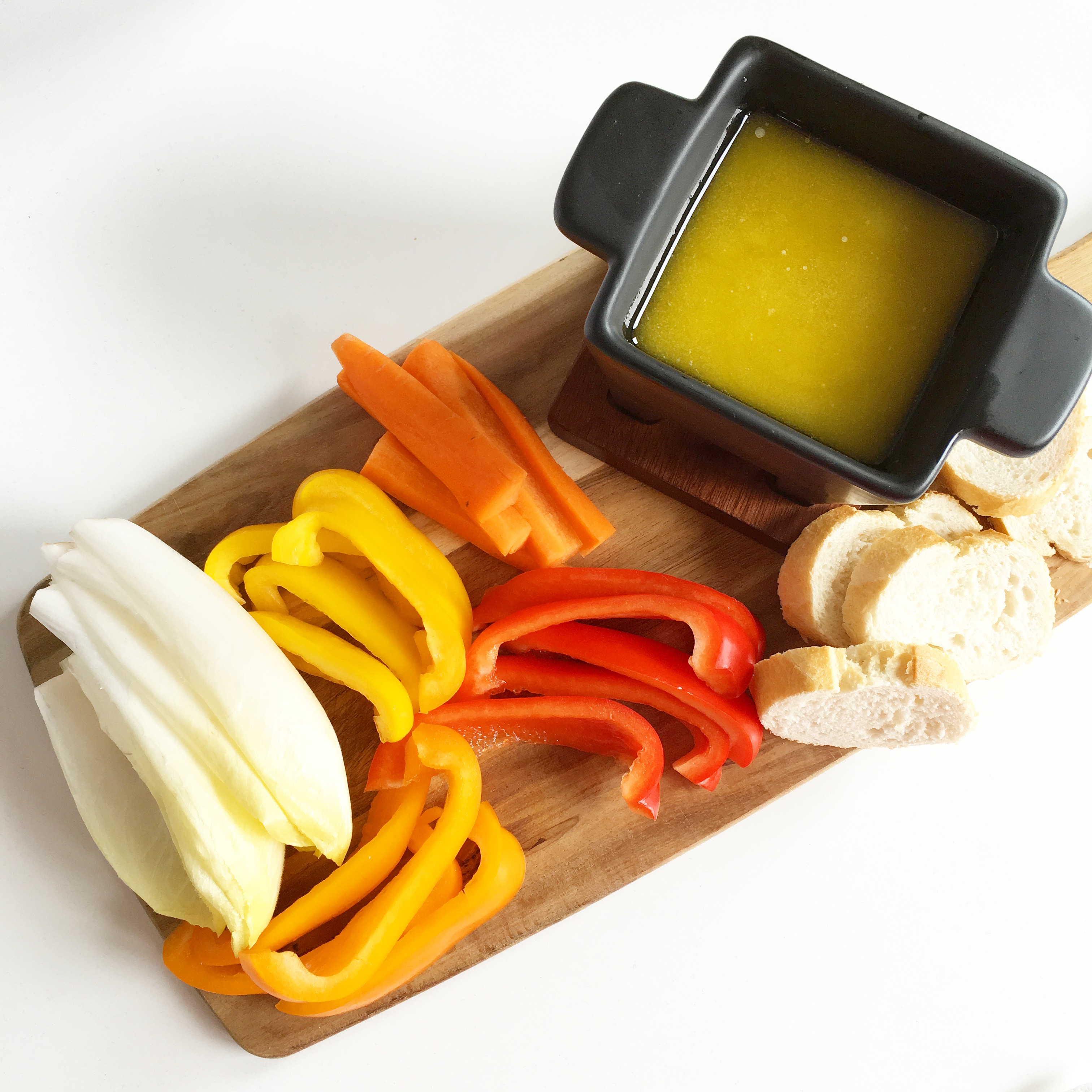 3. Giet over in een klein rechaud met vuurtje eronder zodat het warm blijft en doop met de rauwkost en/of brood.