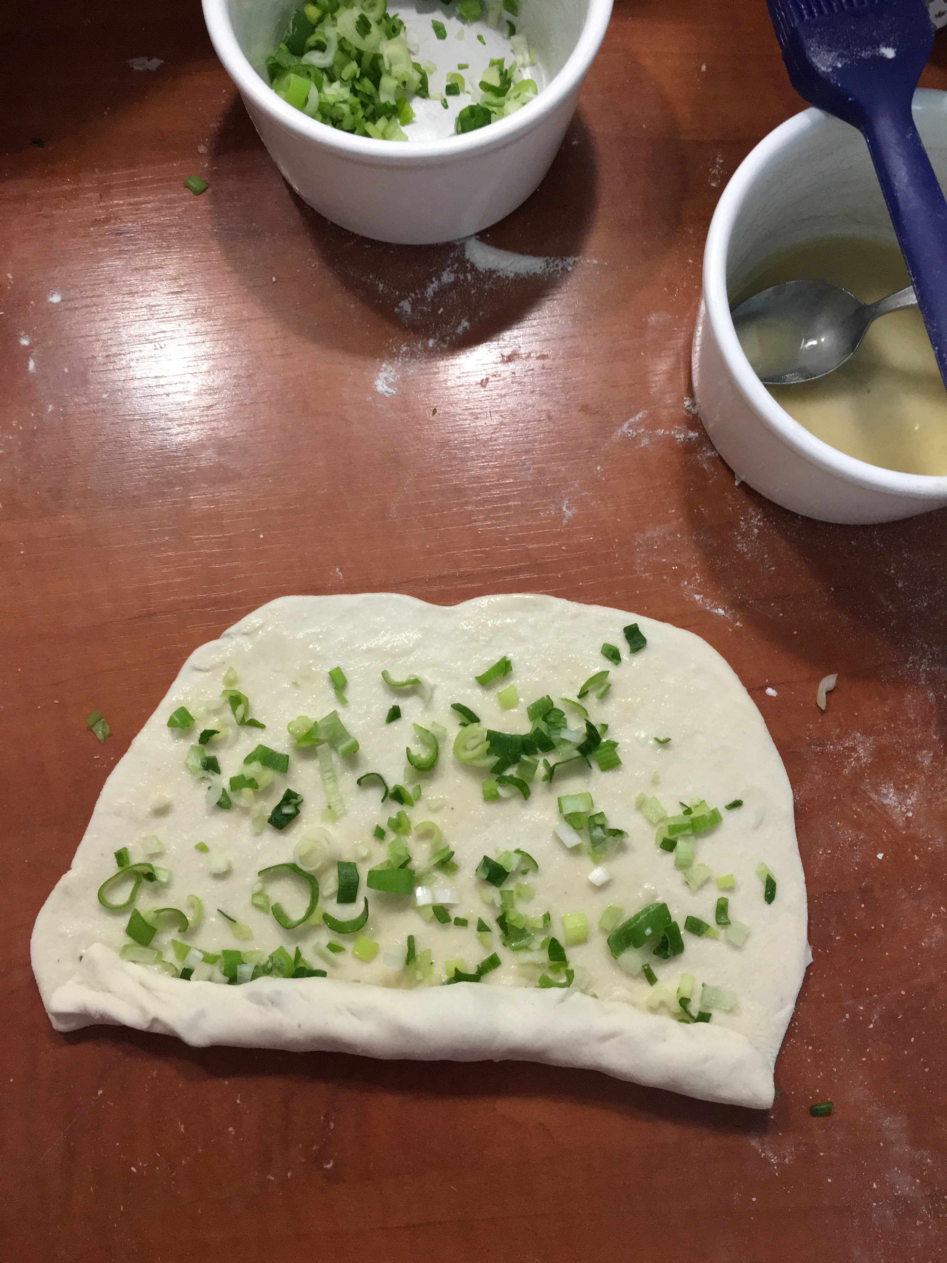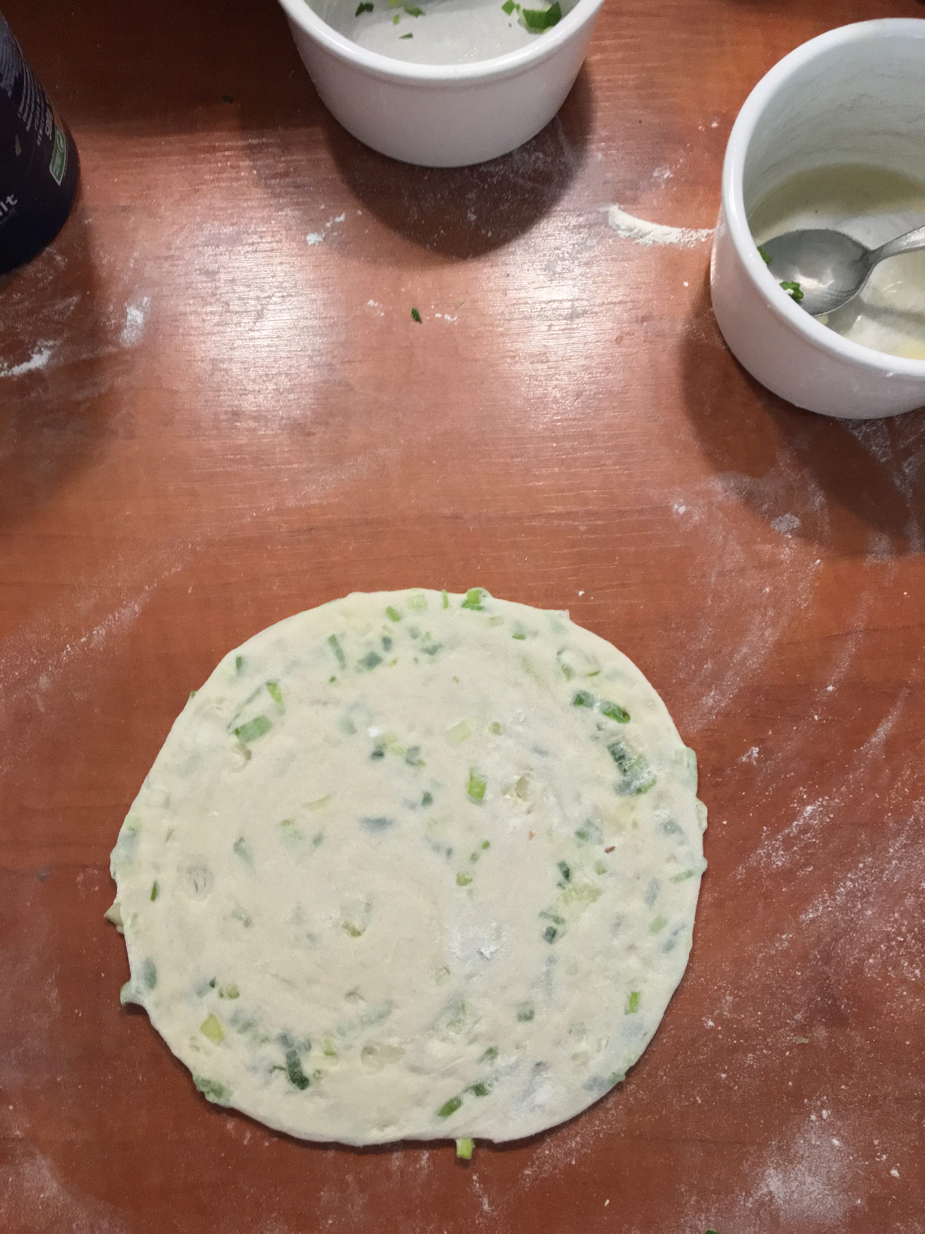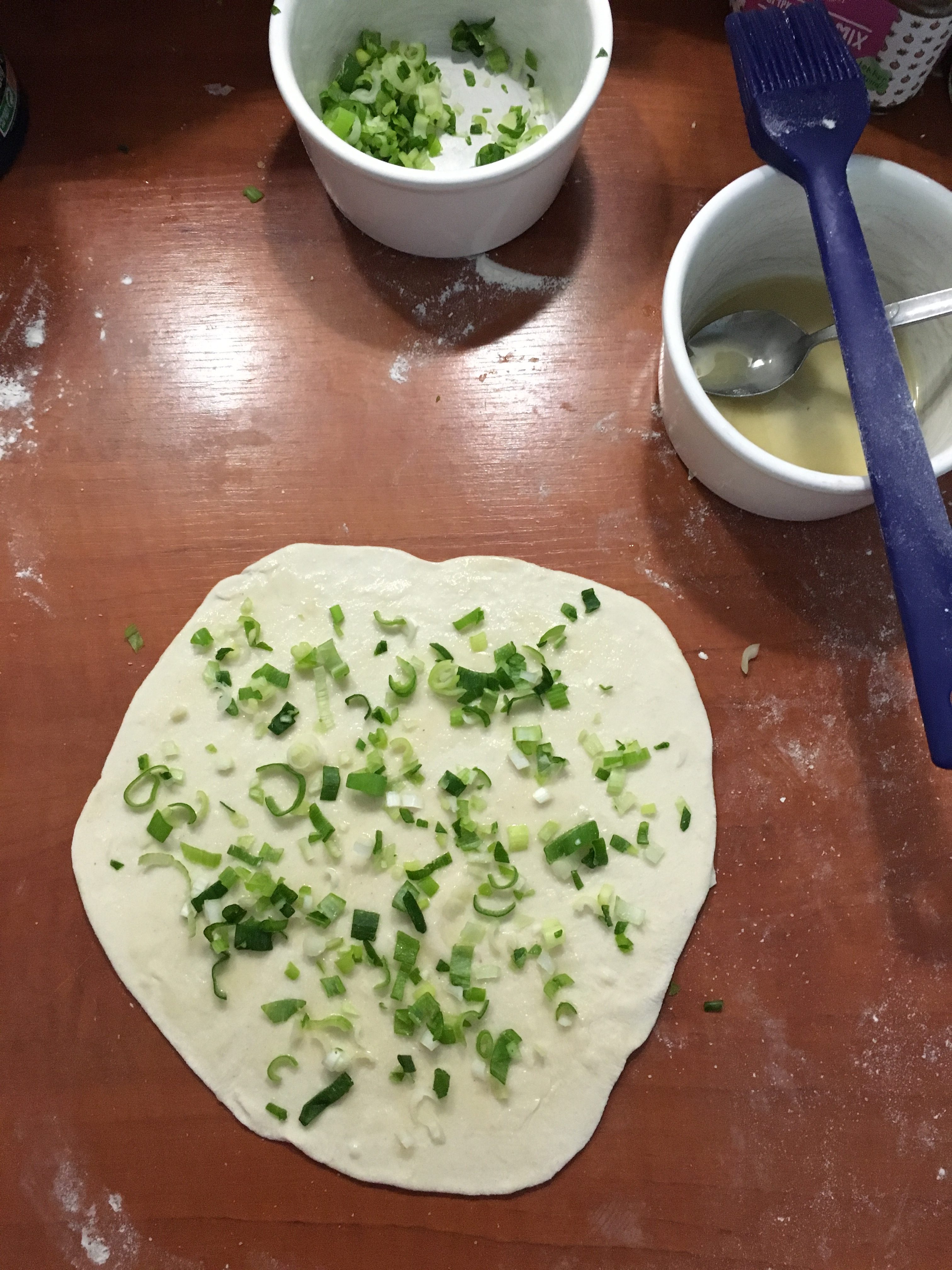 - Rol een bolletje deeg zo dun mogelijk uit. Bestrijk met een beetje olie en bestrooi met zout naar smaak. Verdeel wat fijngehakt lente ui erover.