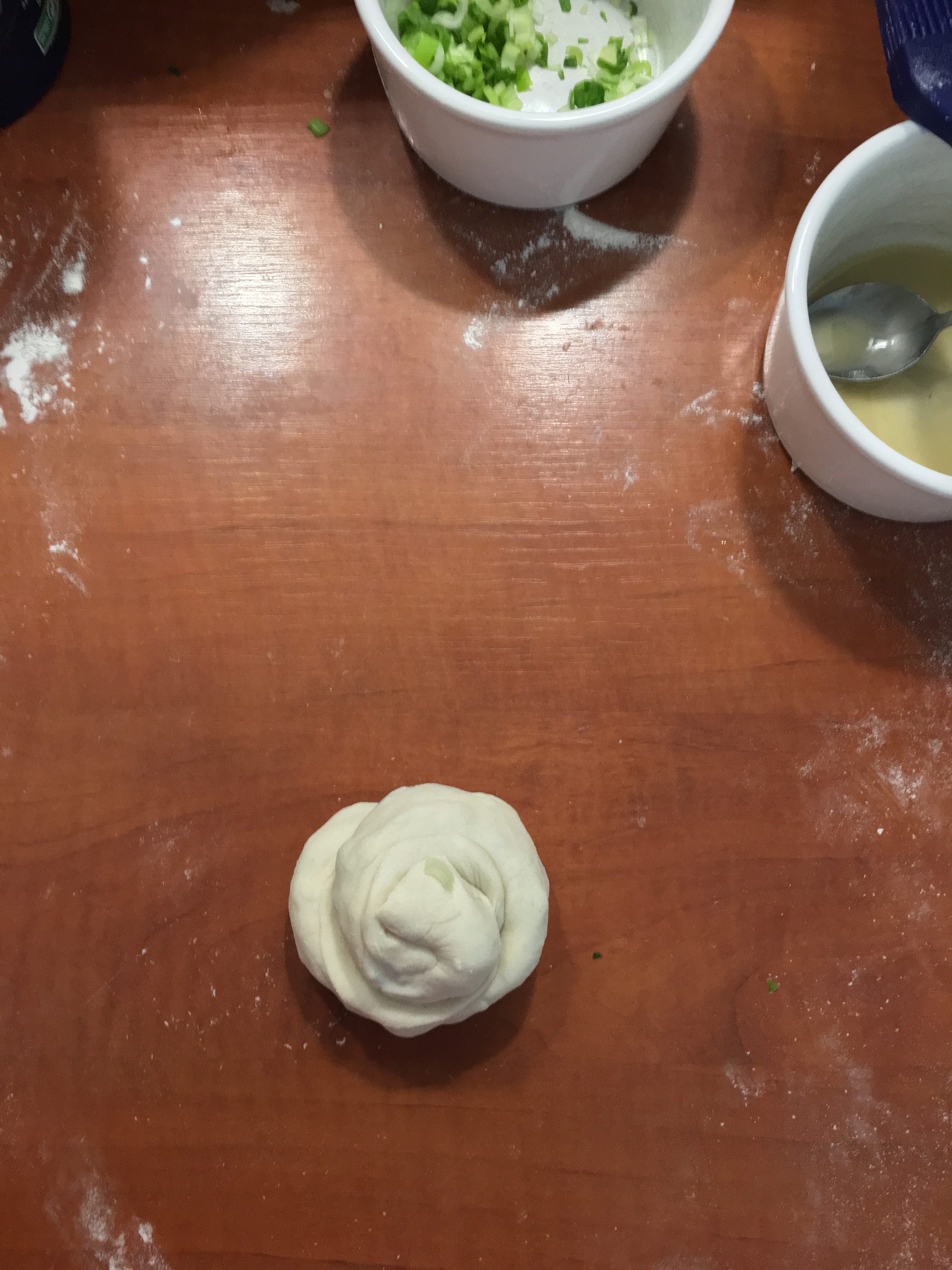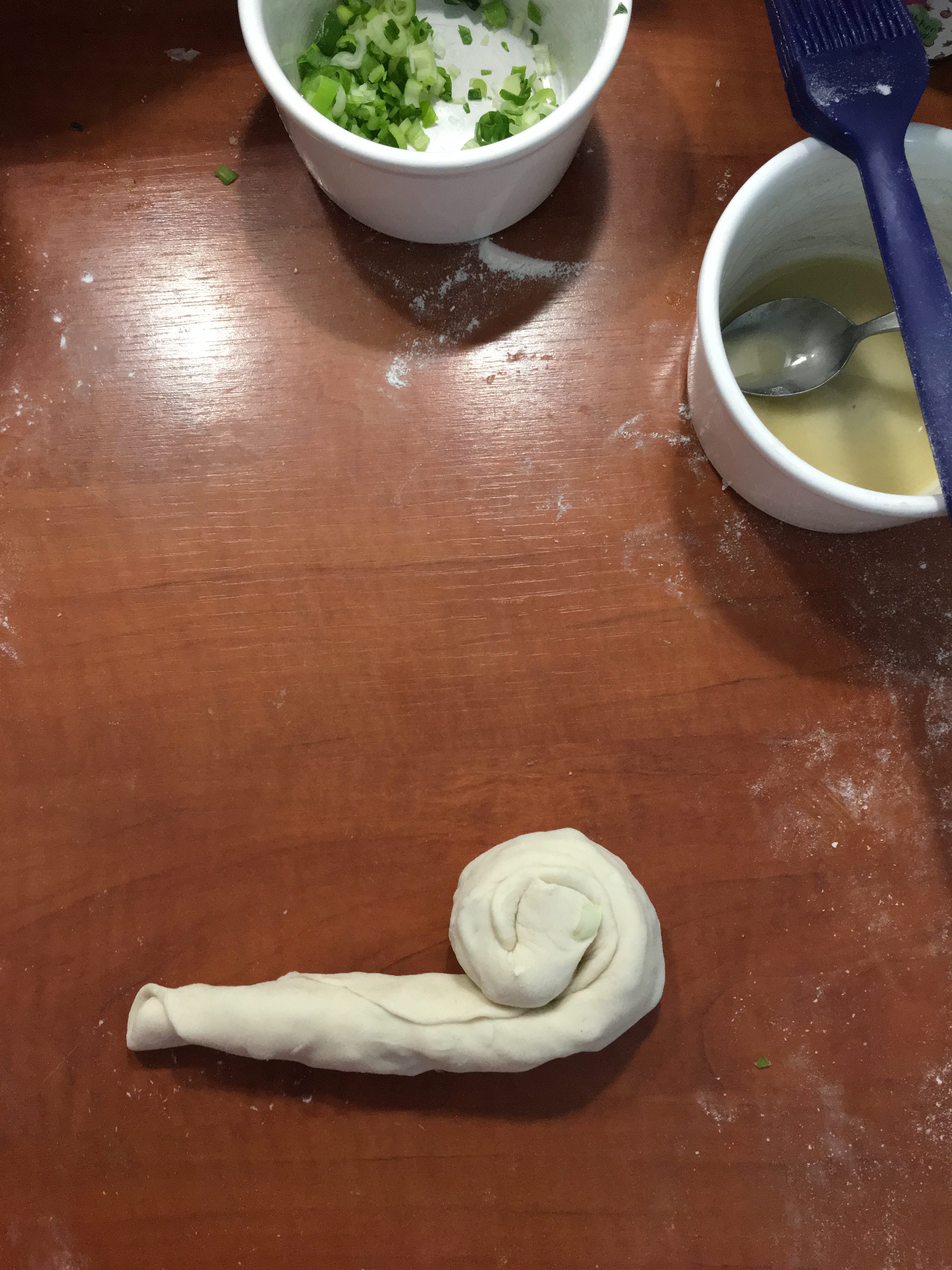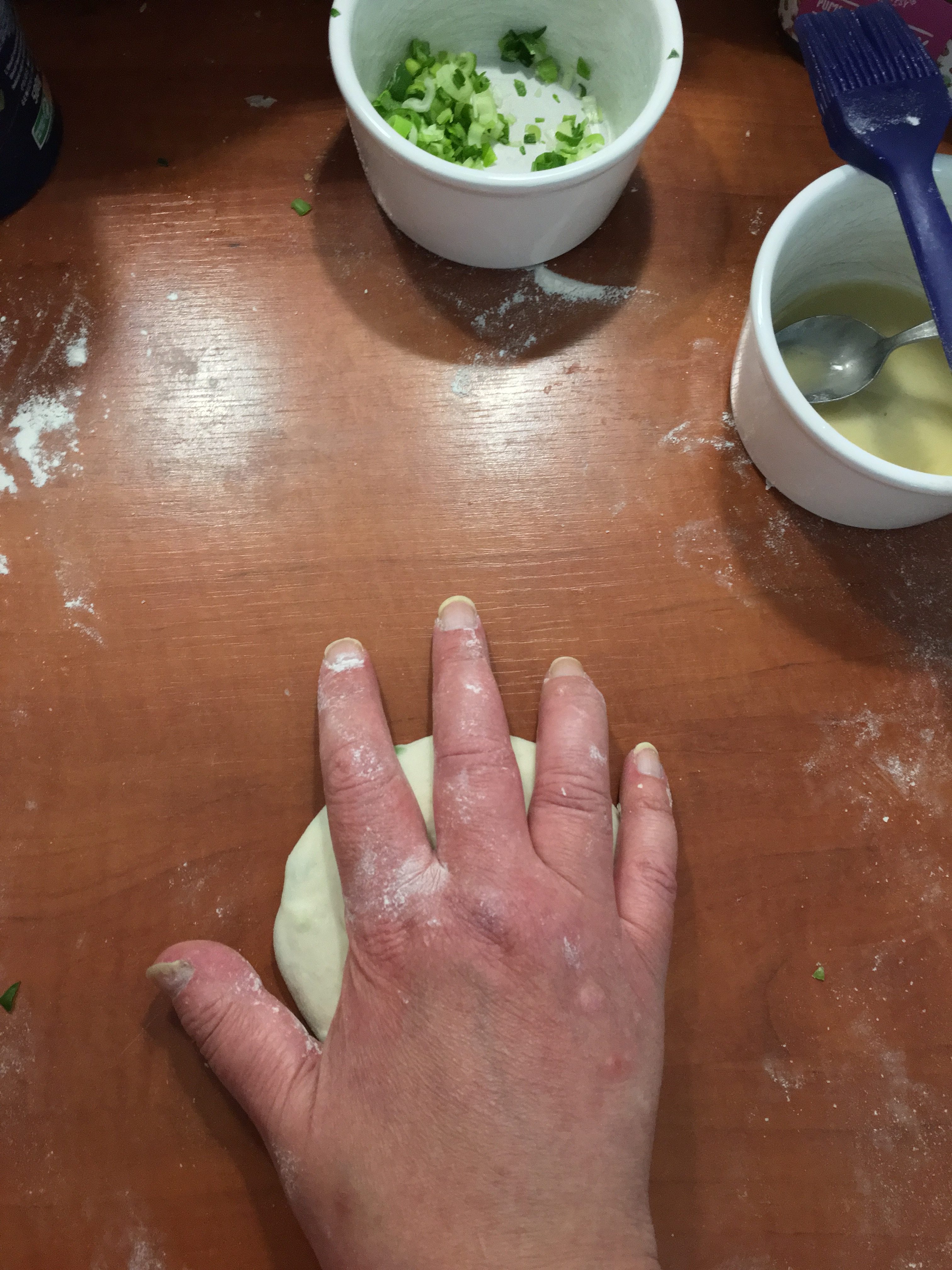 - Rol een bolletje deeg zo dun mogelijk uit. Bestrijk met een beetje olie en bestrooi met zout naar smaak. Verdeel wat fijngehakt lente ui erover.