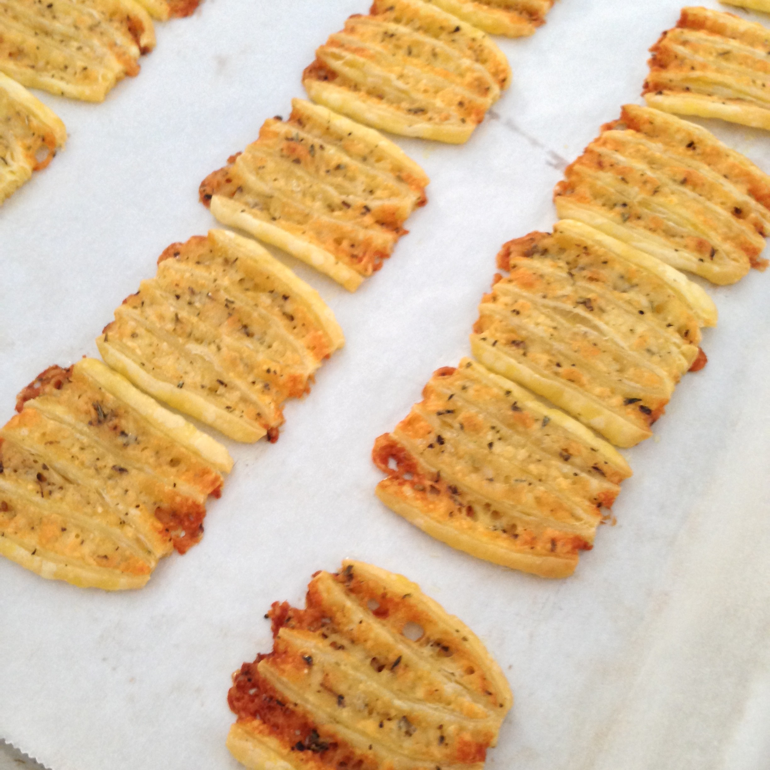 Ik moet ze maar op hun woord geloven maar de collega’s van de Man, voor wie ik regelmatig de kaasstrikken heb gemaakt, waren nog enthousiaster over deze Italiaanse versie! Lees maar onderaan bij de reacties op de kaasstrikken. Het staat er echt. Dus ik zou zeggen, probeer deze ook eens een keer. Of maak ze allebei tegelijk. Daarom heb ik de kaasstrikken gedraaid en deze Italiaanse versie plat gehouden. Nou ja goed, je proeft het verschil ook wel.