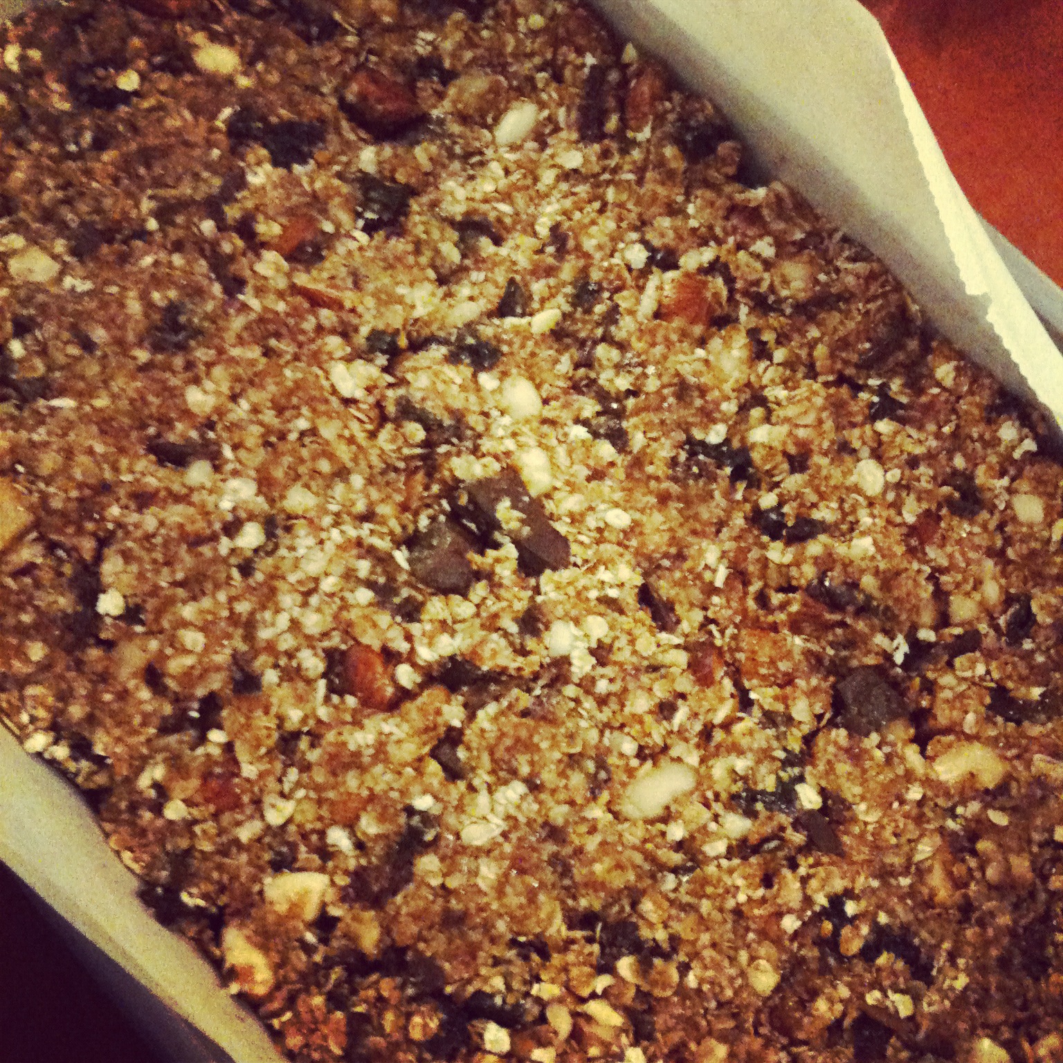 Ik kom op meerdere blogs recepten tegen om je eigen mueslirepen of granola bars te maken. En dat leek me ook wel wat. Maar was tot op heden nog niks tegen gekomen waardoor ik gelijk naar m’n keuken ging. Ja, tot nu dan. Komt ook een beetje omdat ik, wederom, alle ingrediënten al in huis had.