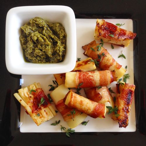 - Snij de Palm Harten in stukken en rol op in een half plakje bacon.