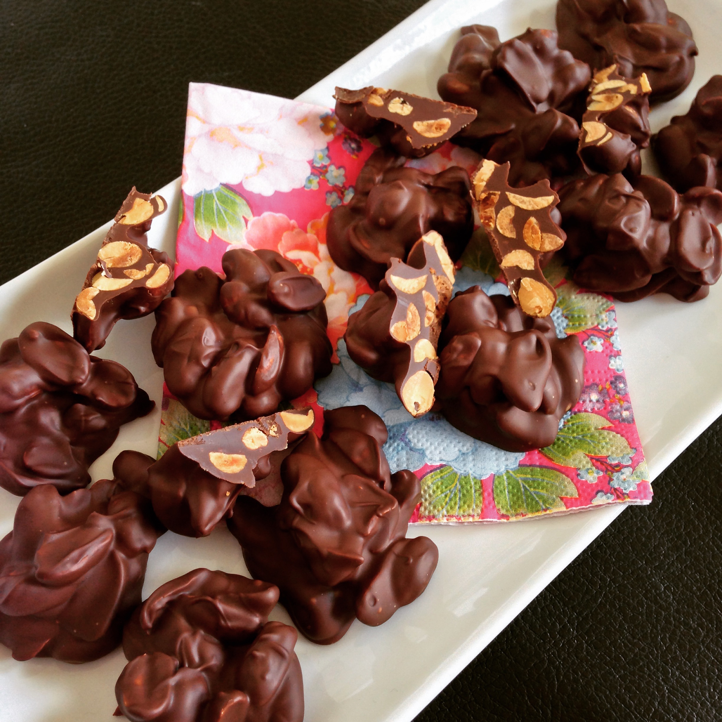 Deze pindarotjes had ik gemaakt toen Bonuszoon hier was. Je snapt dus wel dat het schaaltje binnen no-time leeg was. Ik had een zakje met rauwe pinda’s liggen. Die heb ik eerst in de oven geroosterd. Dat doe je in een oven die op 175 graden is voorverwarmd. Spreid de pinda’s uit op een bakplaat, evt met bakpapier bekleed, en rooster in ongeveer 15 minuten bruin. Hussel regelmatig even om. Eenmaal mooi goudbruin doe je ze in een schaaltje. Nu zou je ze kunnen zouten. Laat zeker een uur afkoelen voordat je ze gaat verwerken tot pindarotsjes.
