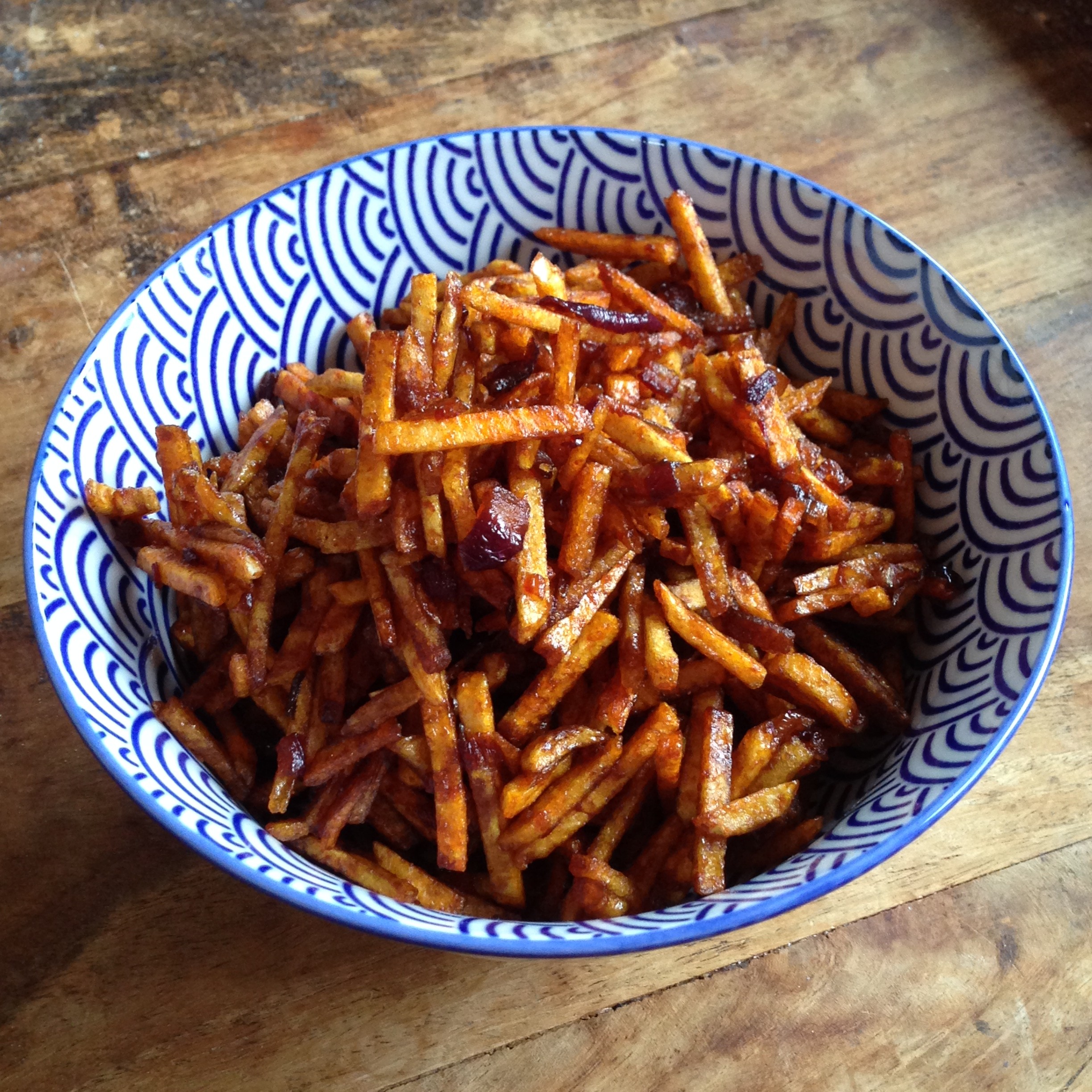 Deze pittige frietjes stonden al zo lang op mijn lijstje om eens te maken. Ik had ze wel eens bij de Toko gekocht maar zelf maken leek me toch leuker en lekkerder. Zo af en toe zag ik foto’s van deze frietjes voorbij komen en die deden me herinneren aan het feit dat ik ze toch echt eens moest gaan maken. Maar om de een of andere reden deed ik dat steeds niet.