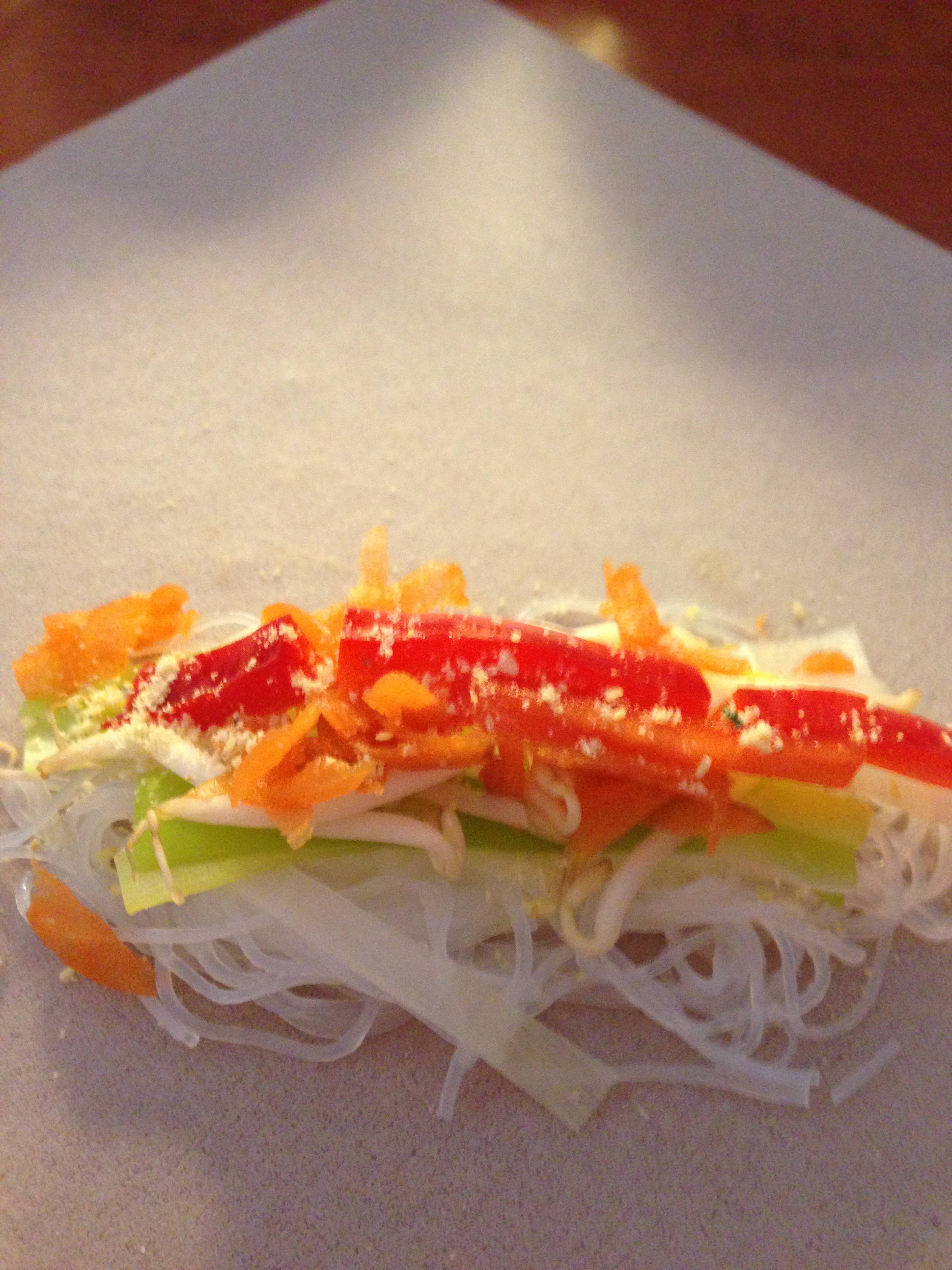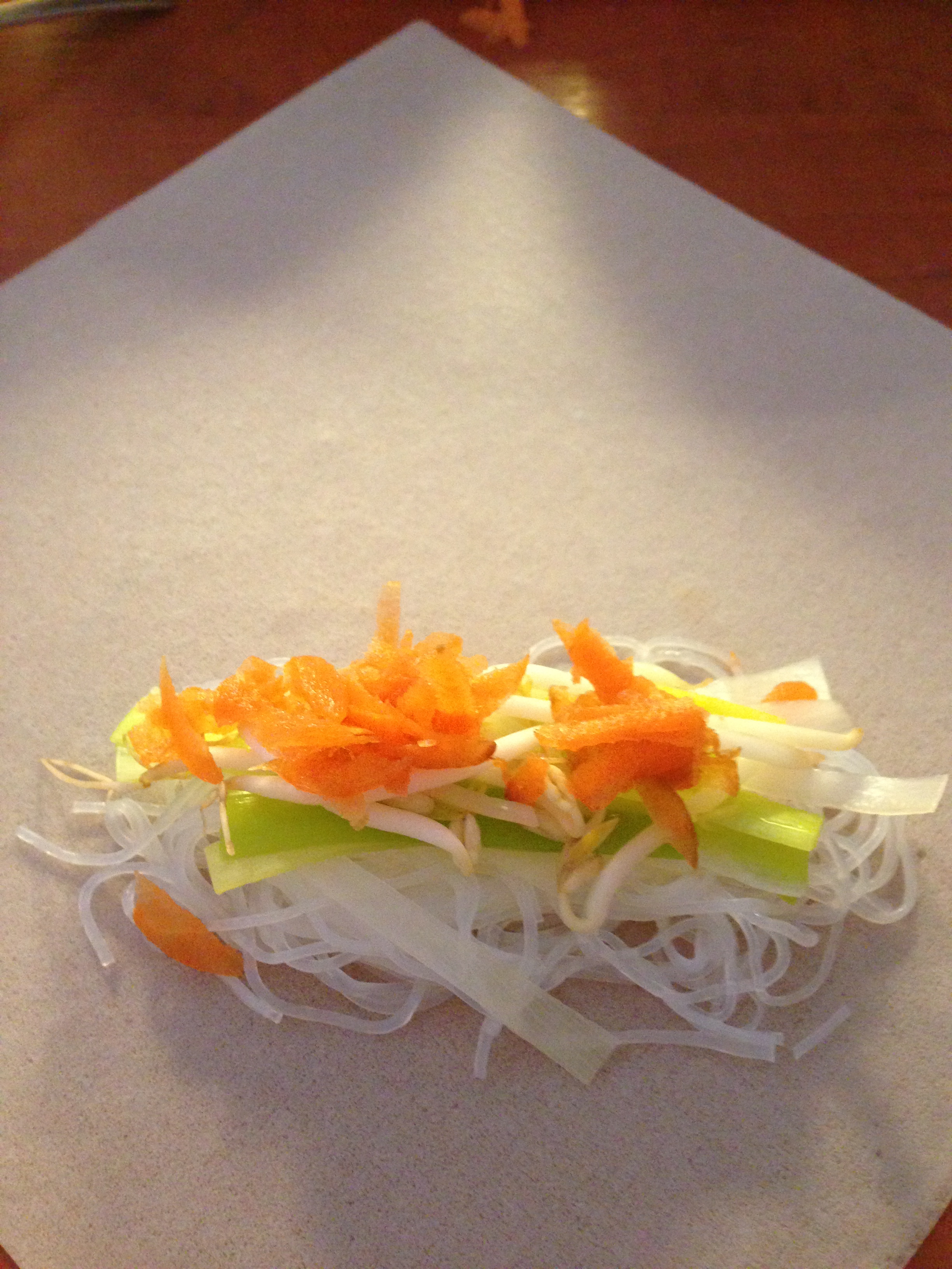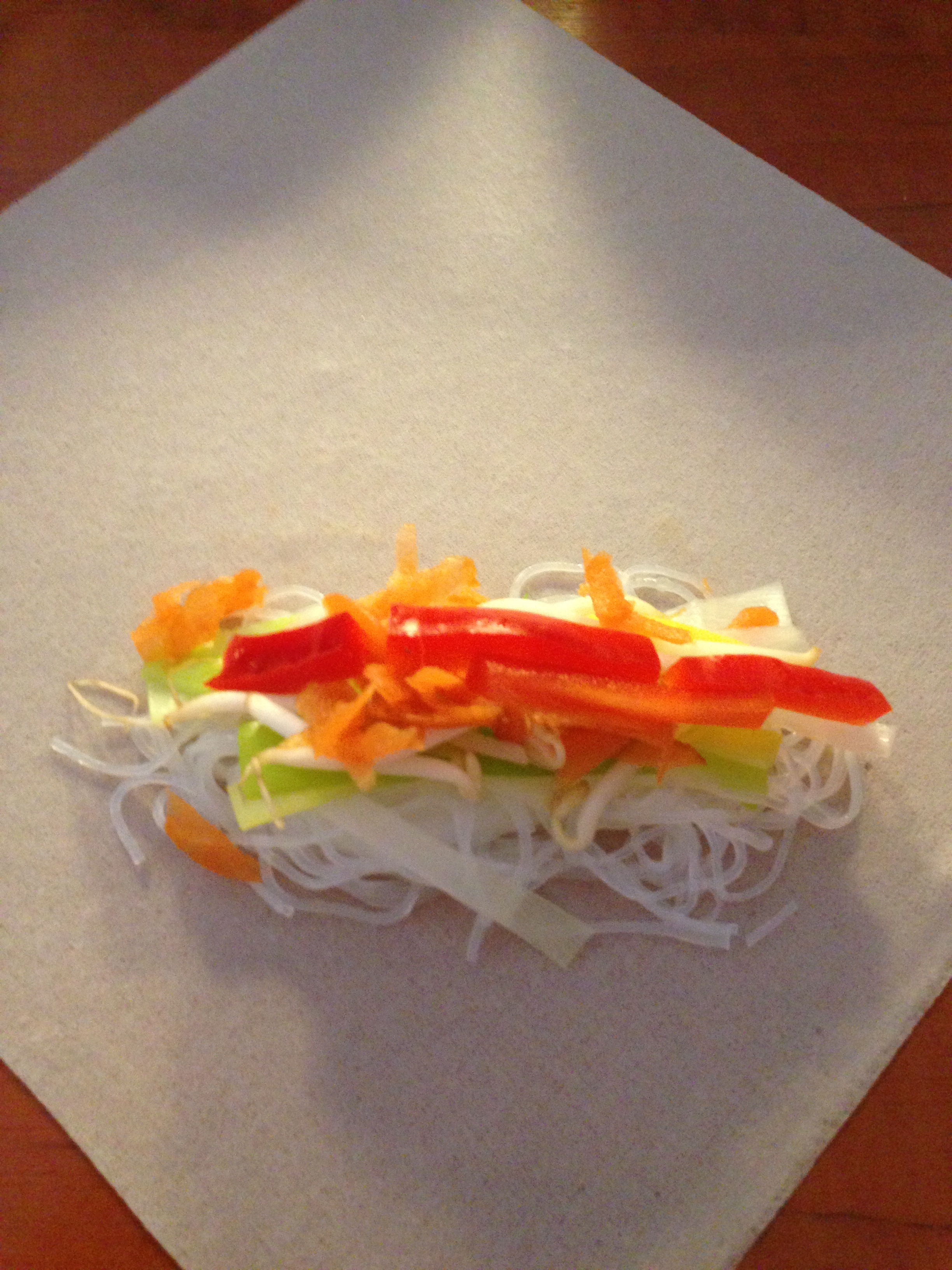 Zet een pan met water met zout op en breng aan de kook. Was en snijd de paprika en preien in smalle reepjes. Snij de groenten in een lengte zo lang als een loempiaatje ongeveer is. Zodra het water kookt voeg je de reepjes prei toe en laat het 1 minuutje koken. Haal ze met een schuimspaan uit het water en laat goed uitlekken in een vergiet of zeef. Voeg de noodles toe aan het water en laat het ongeveer 2 minuten wellen, niet koken. Giet ze af en spoel de noodles goed af onder de koude kraan om het kookproces te stoppen. Laat ook deze goed uitlekken. Rasp de worteltjes.