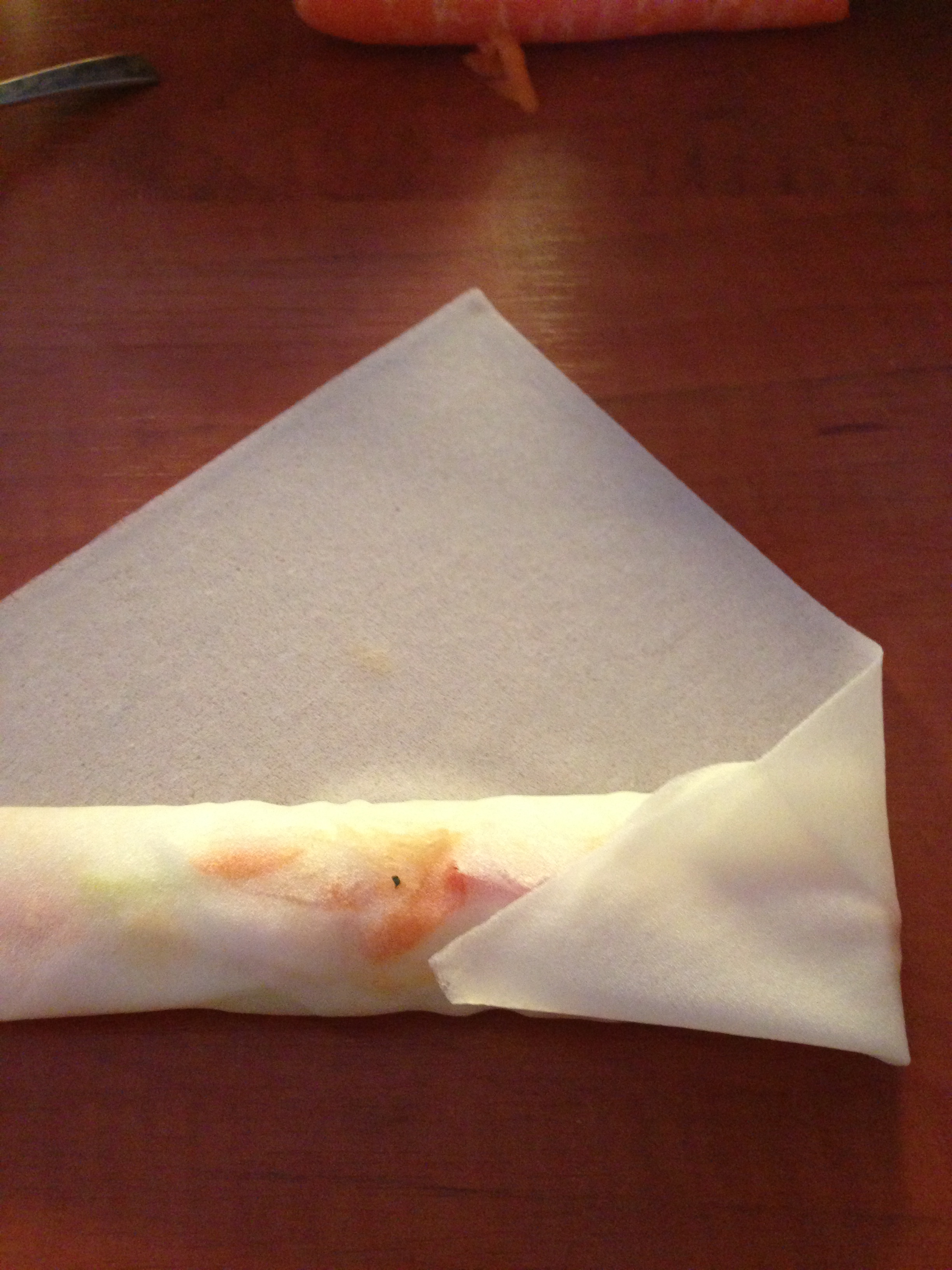 En rol zo bijna helemaal op. Laat het puntje open. Maak je vingers nat met wat water en bestrijk het puntje van de loempiavel.