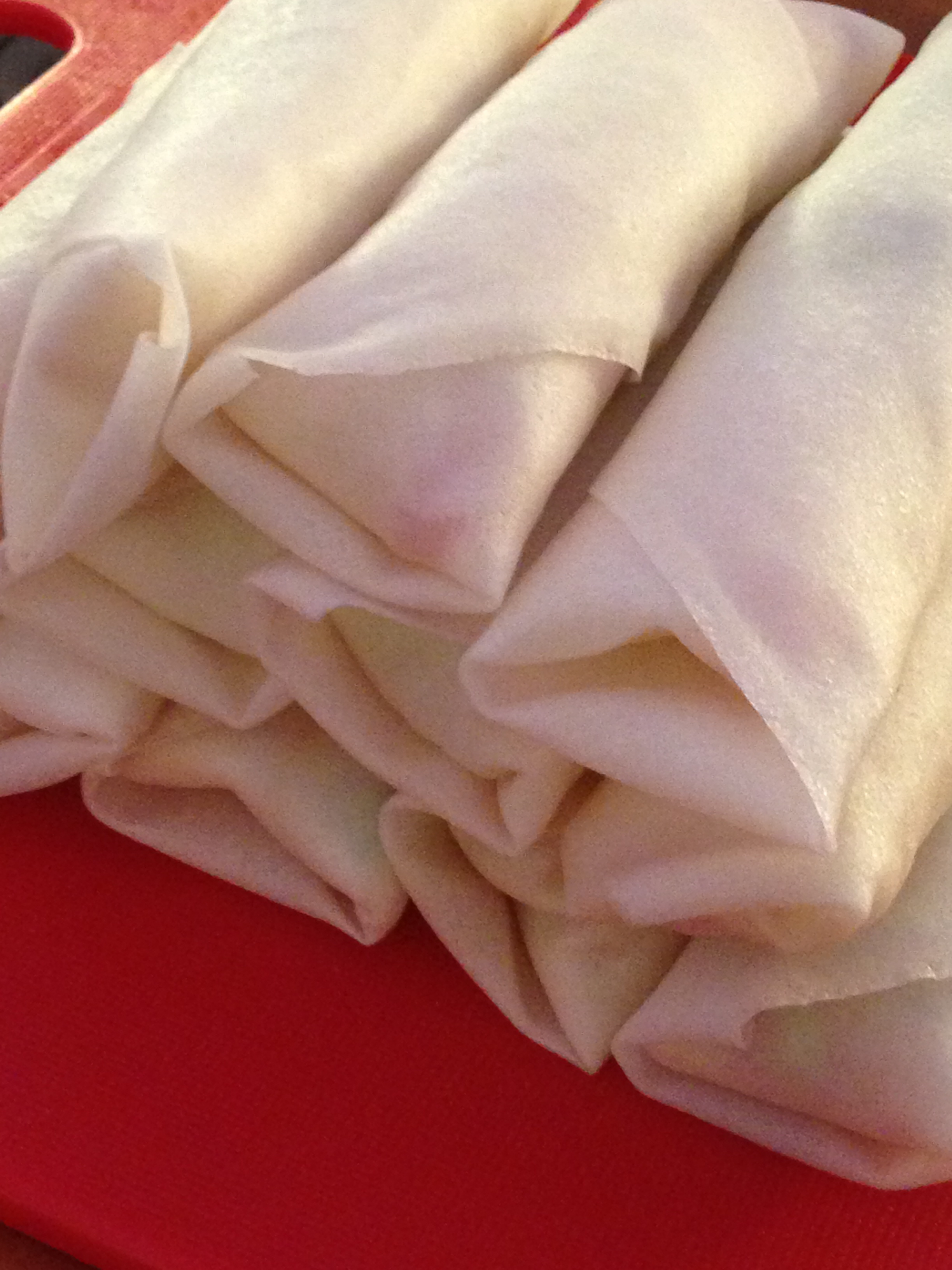 Zo’n loempiaatje vouwen is misschien wel een klusje maar het heeft ook iets therapeutisch. Je zorgt dat alle groenten in schaaltjes klaar staan, je vellen onder een vochtige handdoek en gaan. Ik kreeg er 27 gemaakt, toen was m’n groenten op maar had nog wel vellen over. Die gingen terug de vriezer in. Dus de volgende hoeveelheden zijn bij benadering.