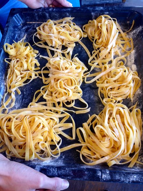 Zoals je je kan voorstellen was het voornamelijk lachen gieren brullen tijdens het koken en het opeten ervan. Naast de keuken waren grote tafels mooi gedekt waar we per gang onder genot van een wijntje het eten konden opeten. Nadat er eerst tig foto’s gemaakt waren natuurlijk! haha.