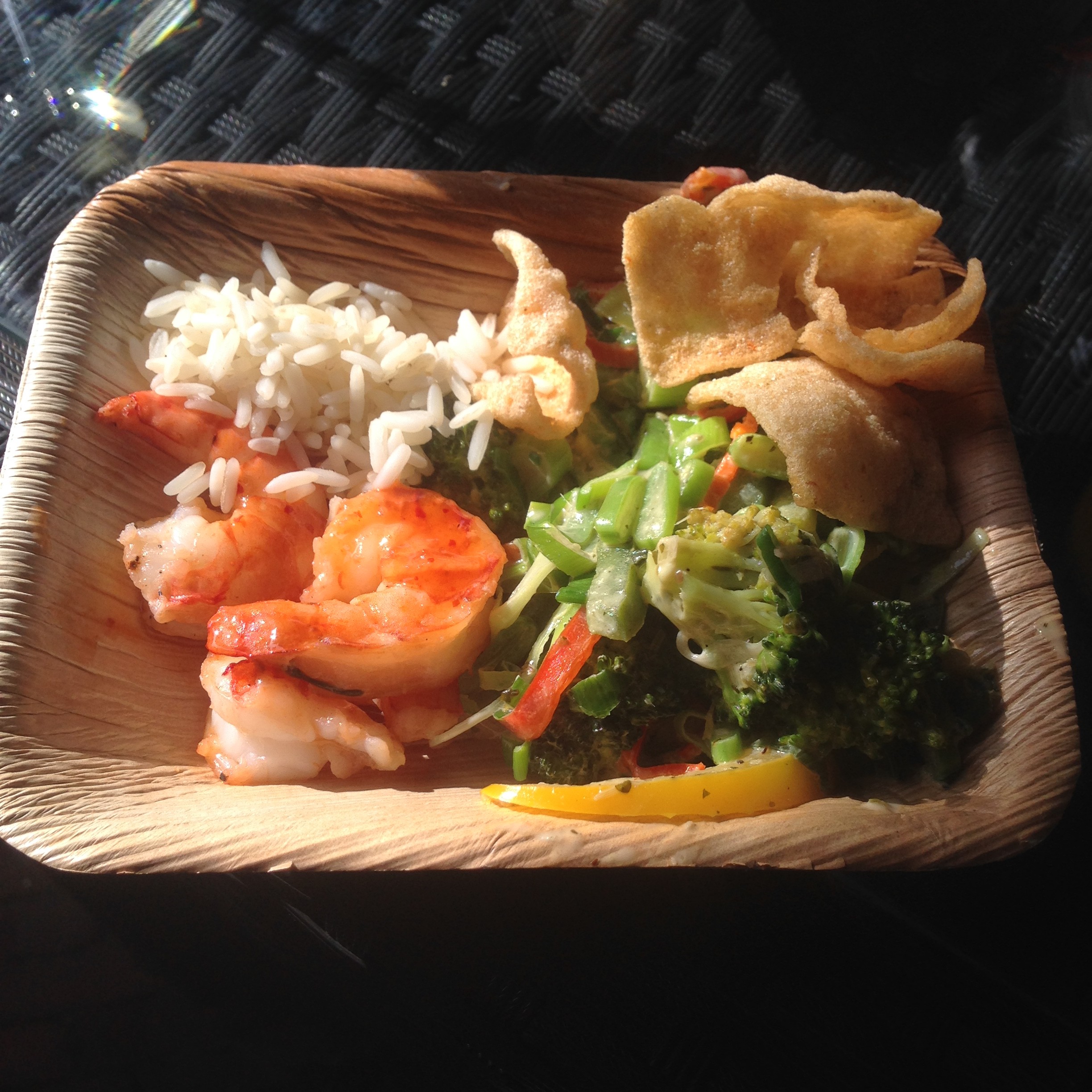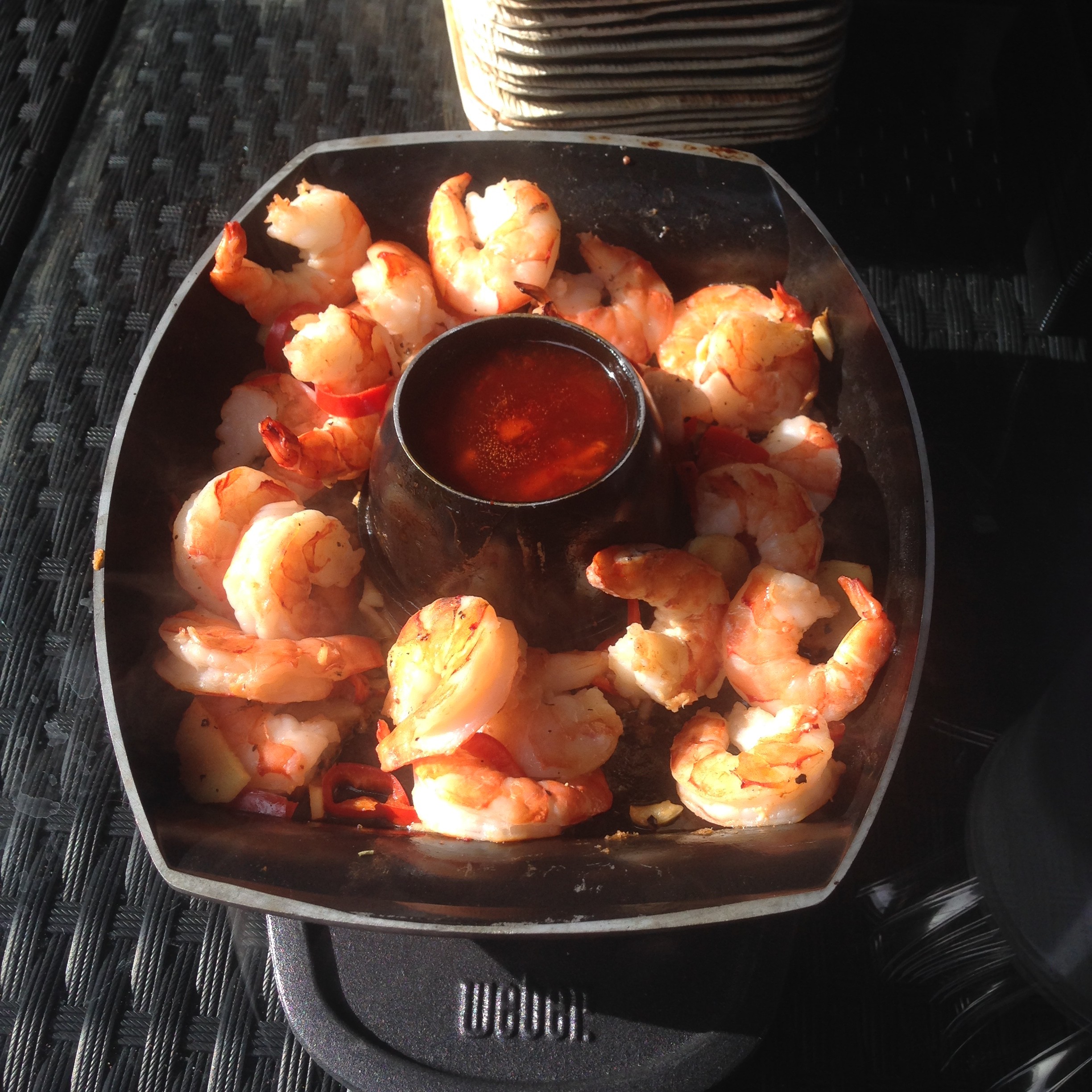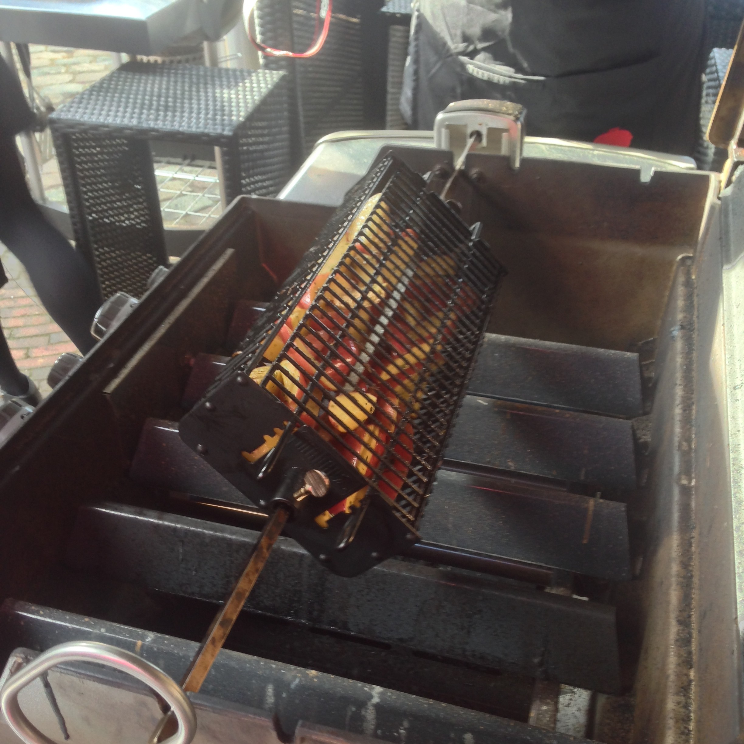 Zo maakten we gamba’s klaar en een curry in de wok. Ja, je kan dus ook wokken op de BBQ. We maakten heerlijke geroosterde aardappeltjes in een roterend rooster. Echt een geweldig ding. Iedereen riep dat ze die ook wel wilden hebben.