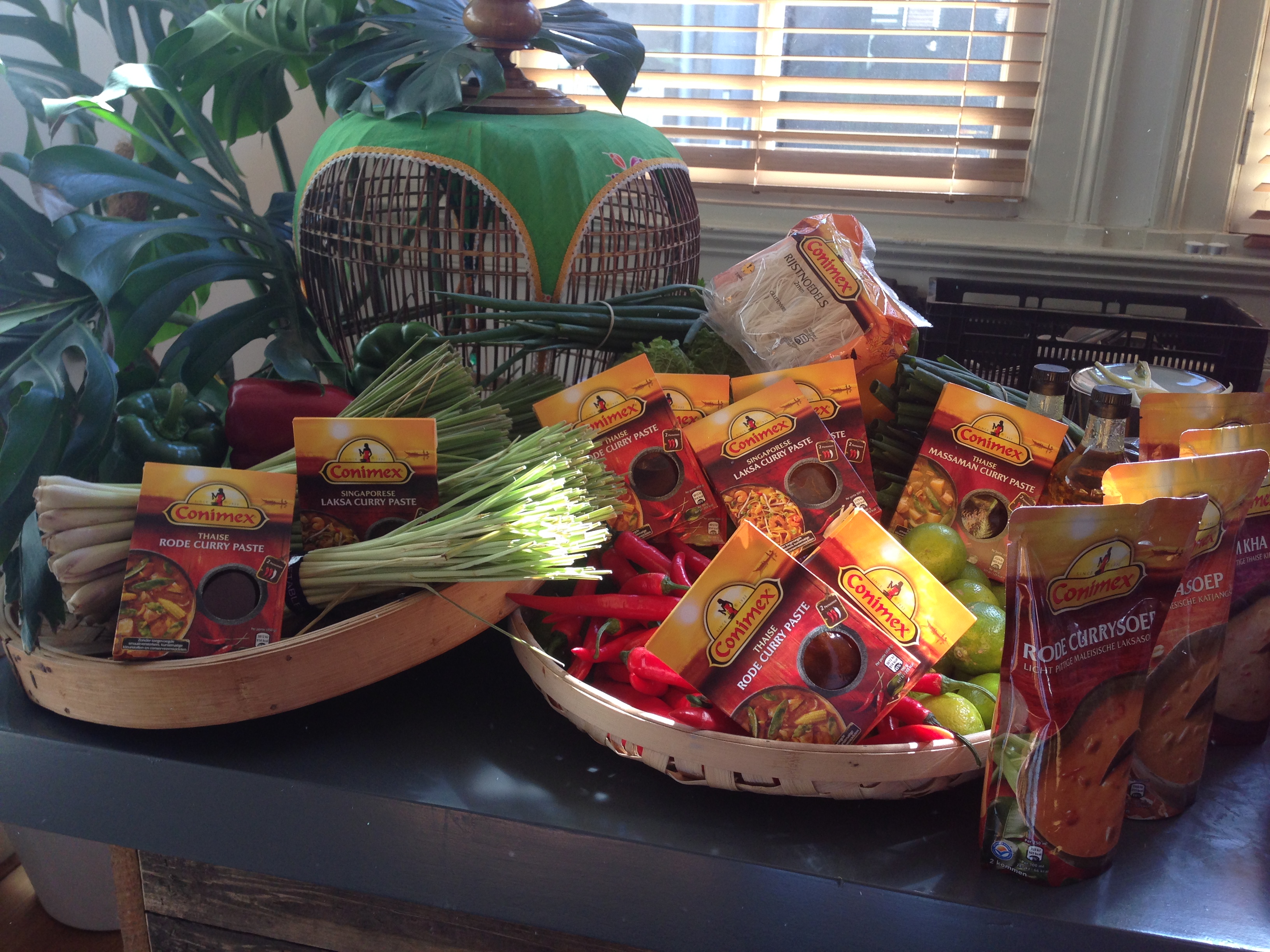 Ik werd uitgenodigd om de nieuwe soepen en curry pastes van Conimex te komen proeven. Dat gebeurde in de uiterst relaxte omgeving van de Nieuwe Yogaschool in Amsterdam. Er ging zelfs een yogales aan vooraf die ik, spelbreker als ik ben, vriendelijk heb afgeslagen. Tja, ik ben nou eenmaal niet meer zo lenig en soepel als vroeger. En toen ik de andere bloggers zichzelf in diverse bochten zag wringen en een tijdje balancerend op 1 been zag staan had ik geen spijt dat ik het aanbod had afgeslagen. Ik kreeg spontaan een tikje meer respect voor de meiden, en 2 jongens die meededen. Na het uurtje rekken en strekken was het tijd om te gaan proeven. Nieuwe soepen en nieuwe curry’s.