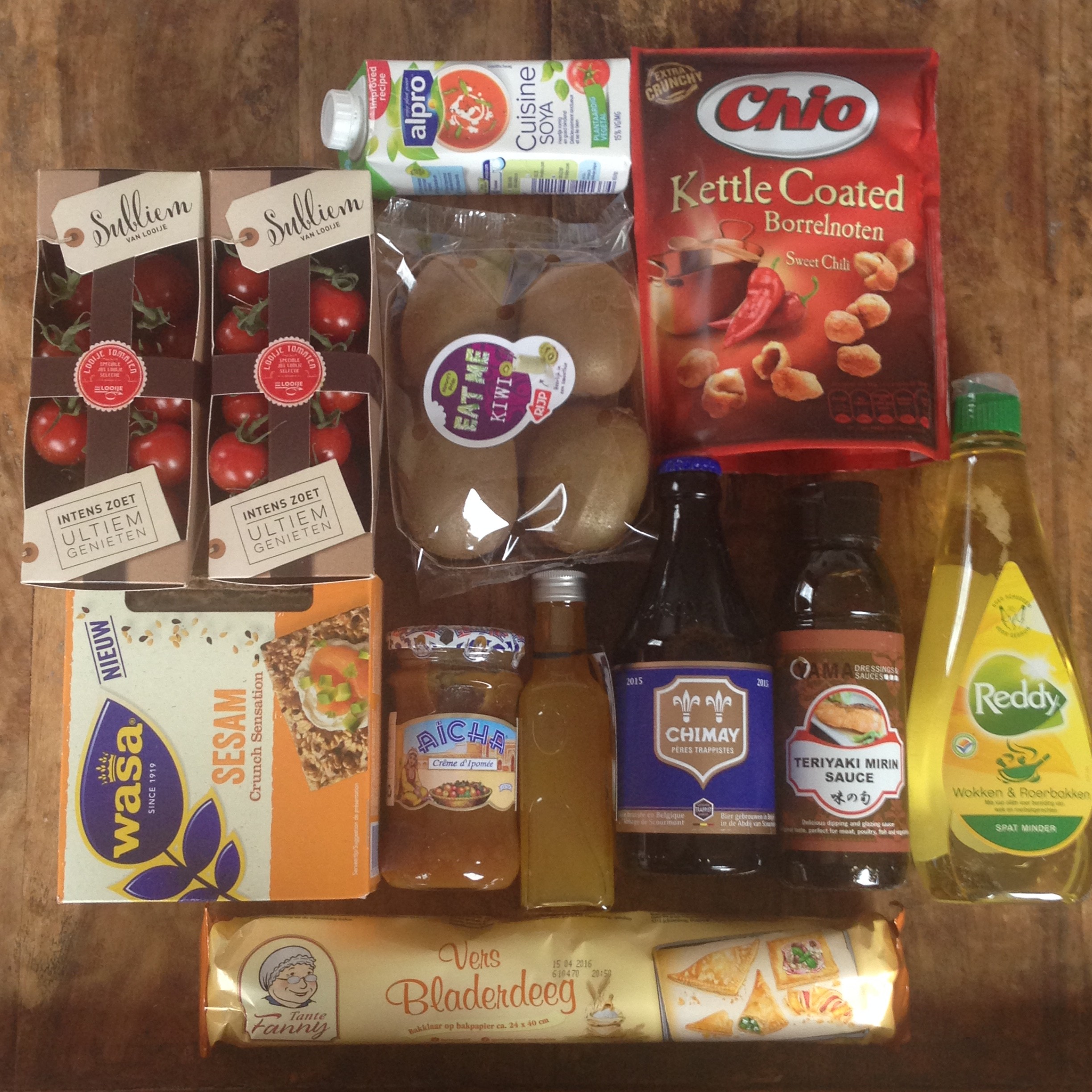 Elke 4 maanden krijgen diverse foodbloggers een foodybox. Een doos vol met nieuwe producten om uit te proberen en lekker mee te gaan koken. Kroon op het Werk maakt er elke keer weer een verrassing van. Een aantal producten heb ik al gebruikt om lekkere gerechten mee te maken. Zo is het bladerdeeg al op net als de tomaatjes en de Alpro Soja. De kiwi’s mocht de Man opeten want ik krijg daar altijd prikkelingen van in mijn mond. Omdat ze er zo lekker uitzagen heb ik er toch 1-tje verwerkt in een smoothie en ook toen was ik gelijk genezen. Prik, prik, prik. Zo jammer. Maar goed. De nootjes gingen ook vrij vlot op. De Man vond ze heerlijk. Ik iets minder. Een beetje te hard. Met de Reddy olie heb ik al gebakken. Voor de rest zie je Wasa Sesam crackers, Zoete aardappelpuree om te verwerken als een soort van caramel. Daar ben ik wel nieuwsgierig naar. Het bier van Chimay en de Teriyaki Mirin saus lijken me ook lekker om ergens in te verwerken. Het flesje links van de Chimay bier is een mangoazijn.