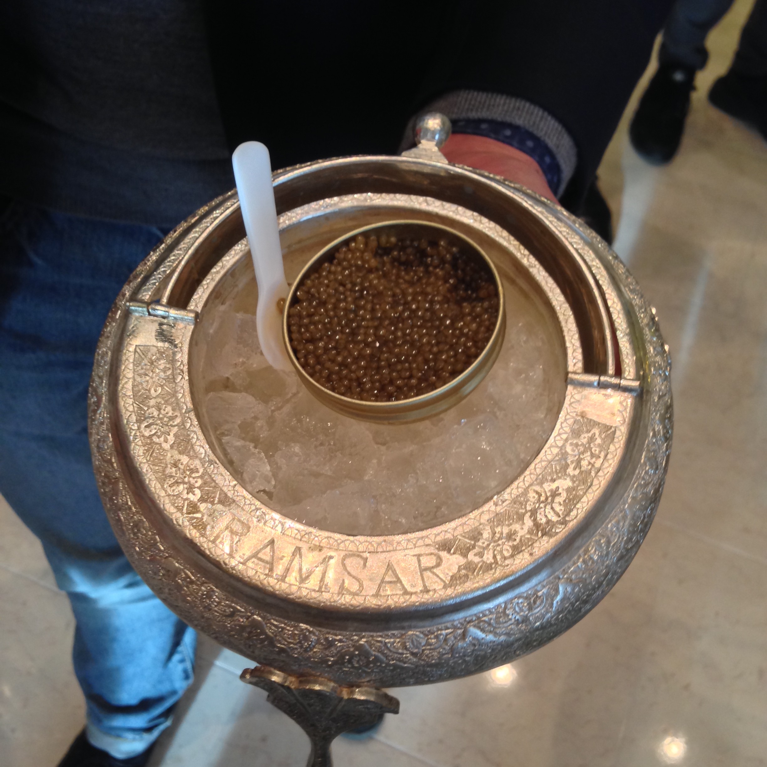 Met een glas champagne werd ik ontvangen in een kleine maar lichte, hoge ruimte met champagneflessen tot aan het plafond en blikken, groot en klein, kaviaar in grote koelkasten en hier en daar een opgezette steur. De eigenaar, Ashkan Mossafaian, hield een leuke intro en vertelde waar de kaviaar vandaan kwam. Hoe het vroeger gegeten werd. En dat de meest bekende manier de Russische klassieker ‘Pomme de Terre Tsarina’ is, vernoemd naar Catharina de Grote. Gepofte aardappel met zure room en kaviaar.