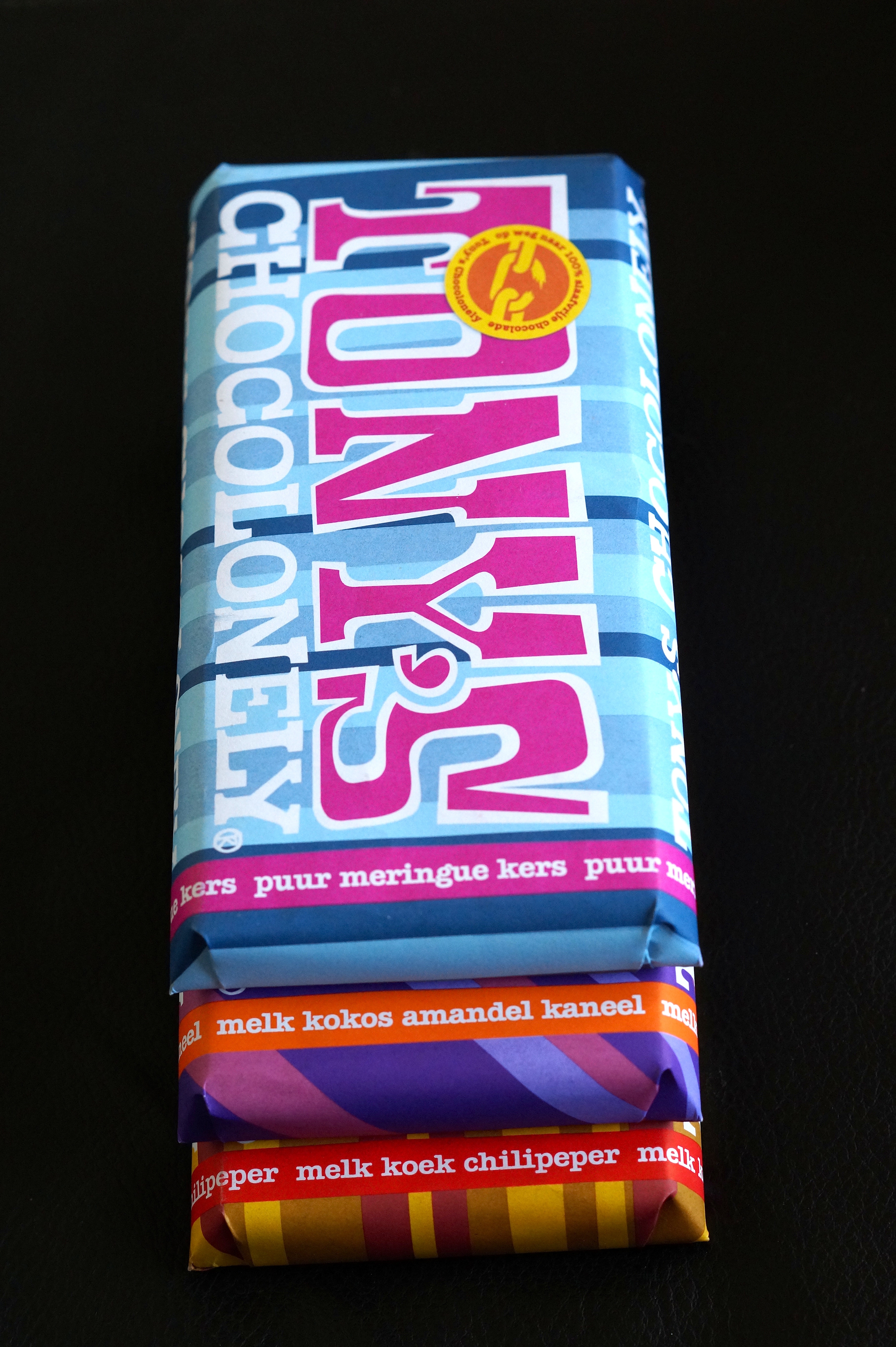 Als ik op volgorde mijn favoriete keuze zou moeten geven is het de Melk Koek Chilipeper op nummer 1. De Puur Meringue Kers op 2 en de Melk Kokos Amandel Kaneel op 3.