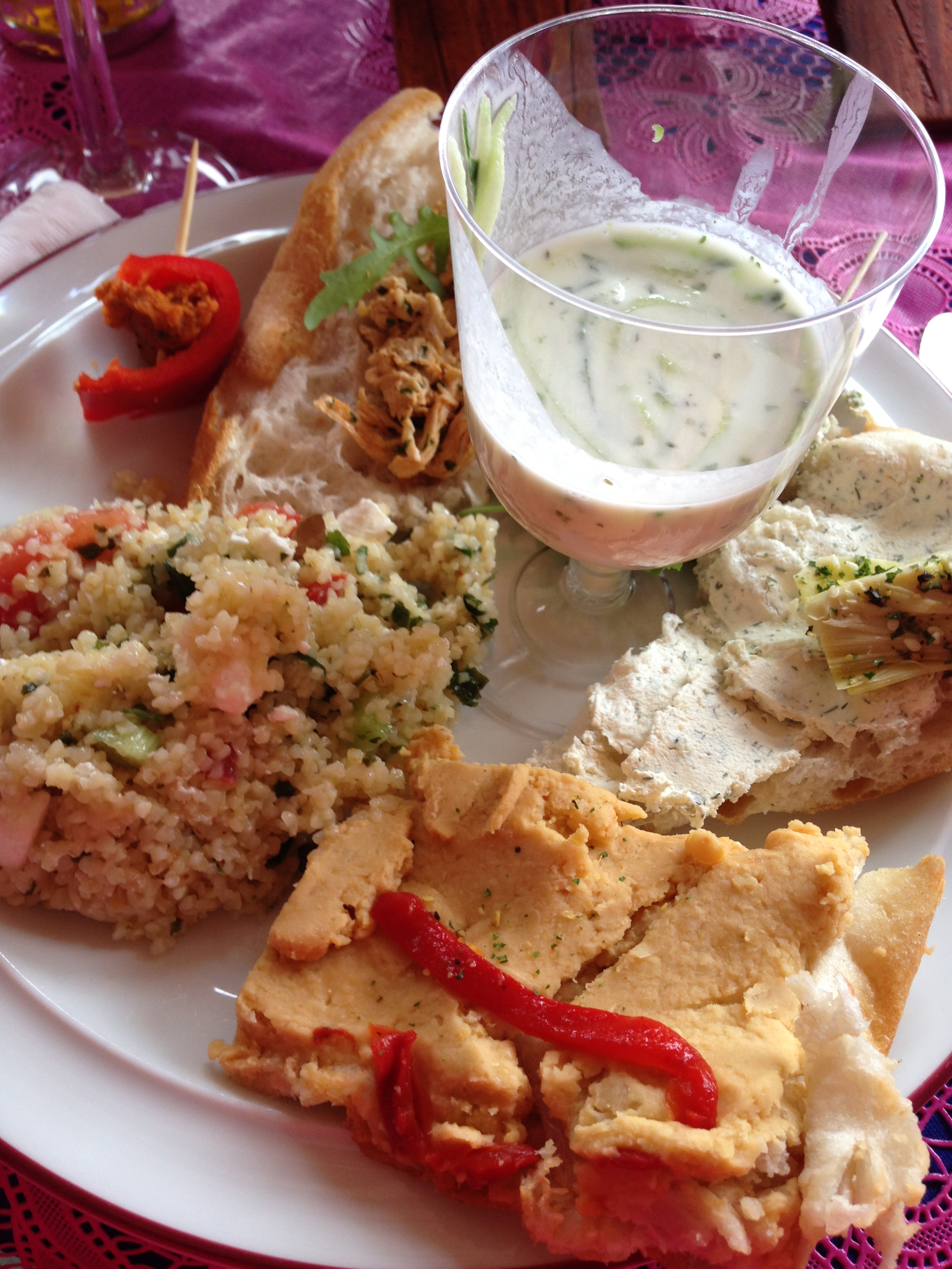 Doordat we in 2 groepen werden verdeeld bleef er 1 groep achter. In de tent waar we in eerste instantie verzamelden stonden tafels met de lekkerste hapjes. Sabina Posthumus van Sabina Kookt! heeft een waanzinnig mooi en lekker kookboek geschreven met heerlijke gerechten. Geïnspireerd op ingrediënten die je op de Oostersemarkt kan kopen. Op die tafels stonden allerlei gerechten uit dat boek wat wij mochten proeven. Het was smullen.
