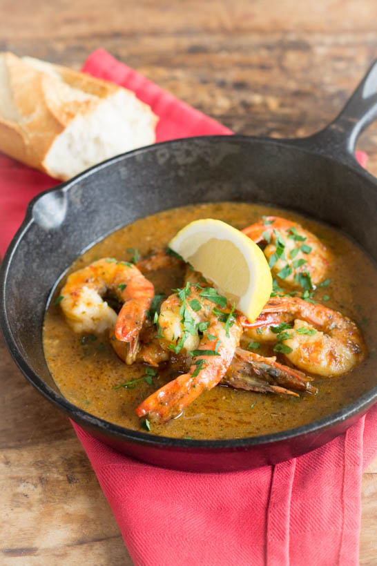Ok, dit is een pittig gerecht, lekker, maar pittig. En dan te bedenken dat ik 1 theelepel rode peper vlokken minder heb genomen dan in het recept staat. Dan merk je pas goed hoeveel er in zo’n maatlepeltje gaat. Ook al is het ‘maar’ 1 theelepel. Het gekke was dat ik het op het randje vond van te pittig zijn maar dat ik toch door bleef eten. Verslavend die hitte. Ik gebruikte black tiger prawns maatje ‘groot’. Het waren joekels. En toch, ik had geen moeite om de pan praktisch leeg te eten. Deed ik niet hoor, ik bewaarde wat voor de Man die ook gesmuld heeft. Dus mocht je het maken voor 4 personen, waarvoor deze hoeveelheid eigenlijk is, neem dan kleinere garnalen. Dan heb je er meer uit een kilo. Eet er vers brood bij om lekker in de saus te kunnen dopen. Eventueel een frisse salade om de boel te blussen. Biertje is ook goed. 🙂Ingrediënten: