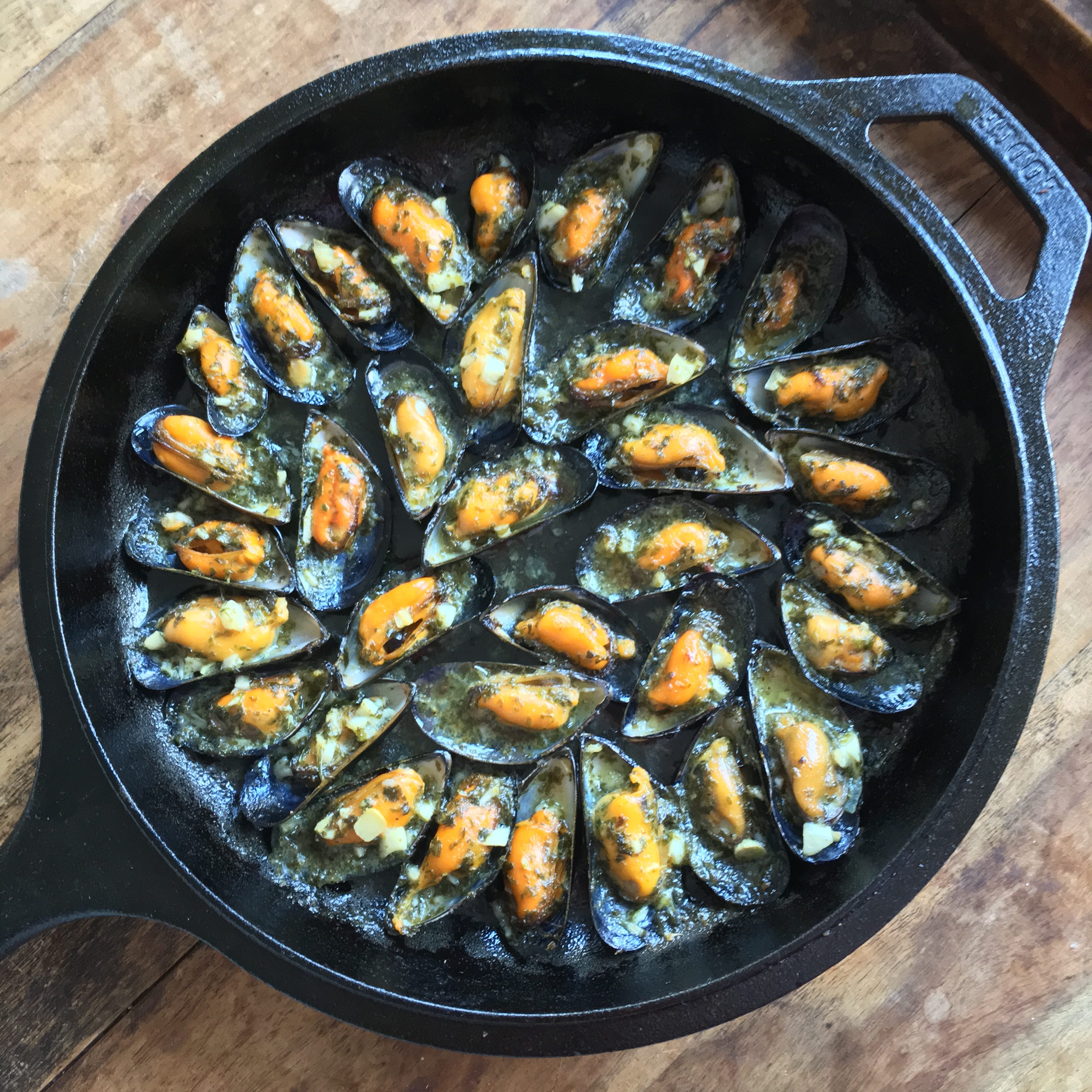 Wat nog meer lekker is van ZTRDG zijn de super verse mosselen. Deze keer heb ik ze eens niet gekookt en zo opgegeten maar gegratineerd met veel knoflookboter. Ik gebruikte 1 kg en dat is genoeg voor 2 personen als lunch maar je zou ze ook bij de borrel kunnen serveren. Geef er vers stokbrood bij om de gesmolten knoflookboter uit de pan te vegen want het is zonde om dat te laten liggen.