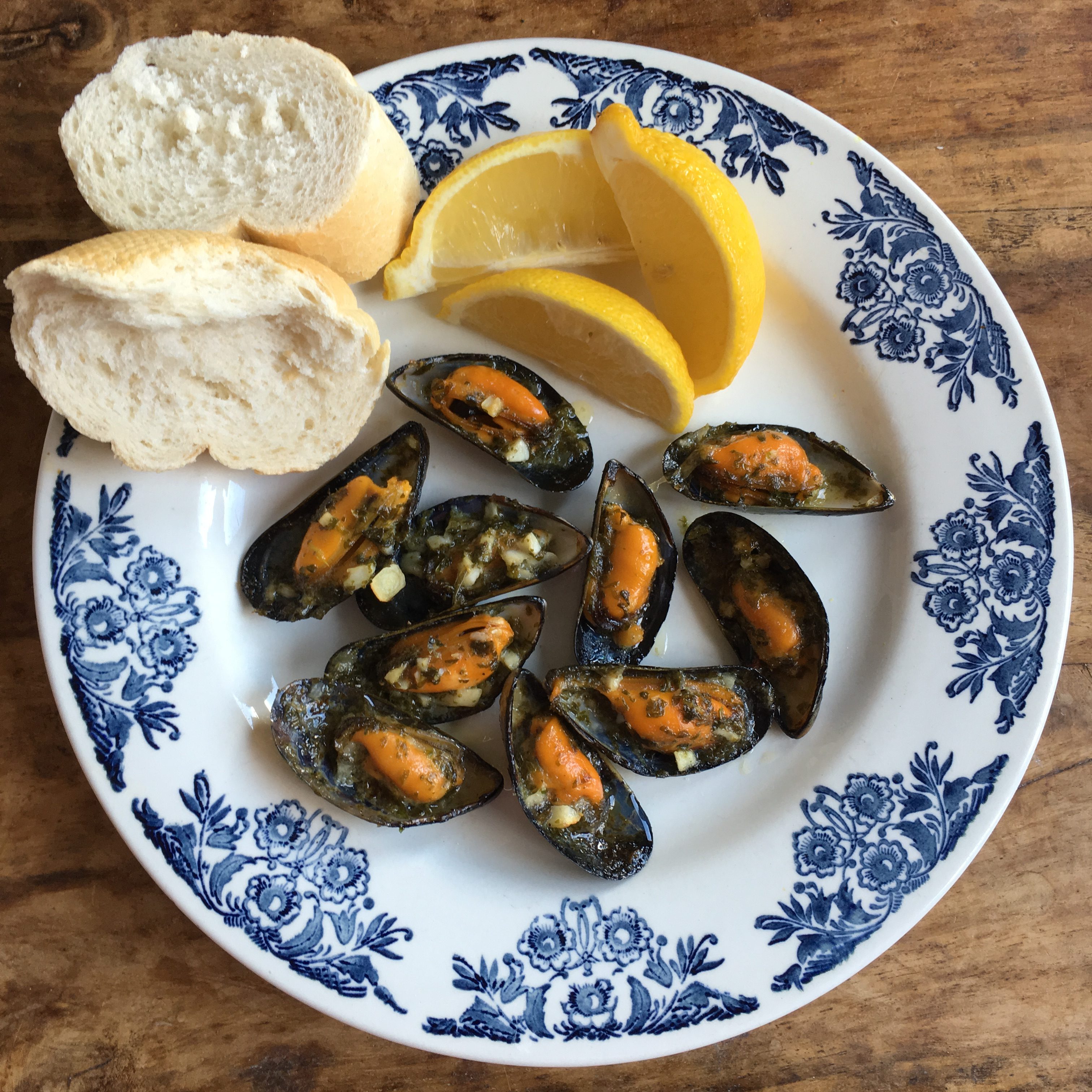 Het is een recept van Delia Smith en wat ik zo lekker vond is dat ze het kookvocht van de mosselen eerst inkookt en vervolgens met de boter mengt. Ingekookt mosselvocht, ik lepel de pan zo leeg als het kan. Met zo weinig poespas zo’n smaakvolle saus krijgen is verrukkelijk.