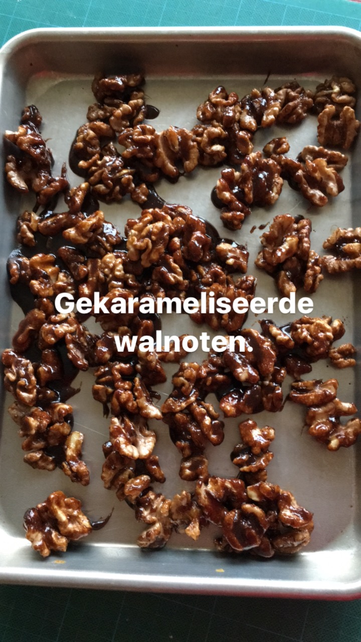 Deze foto was een gevalletje van even snel een foto voor Instagram maken en de bedoeling hebben om later nog een foto voor de blog te maken maar dat dus straal te vergeten en inmiddels de walnoten al grotendeels gebruikt te hebben. Zo, dat was een lange zin. Maar goed, nu moest ik dus de Instagram foto met tekst maar gebruiken. Hopelijk hebben jullie daar geen bezwaar tegen. Er is nog best goed zichtbaar wat er op de foto staat toch? Walnoten met een karamellaagje dus.