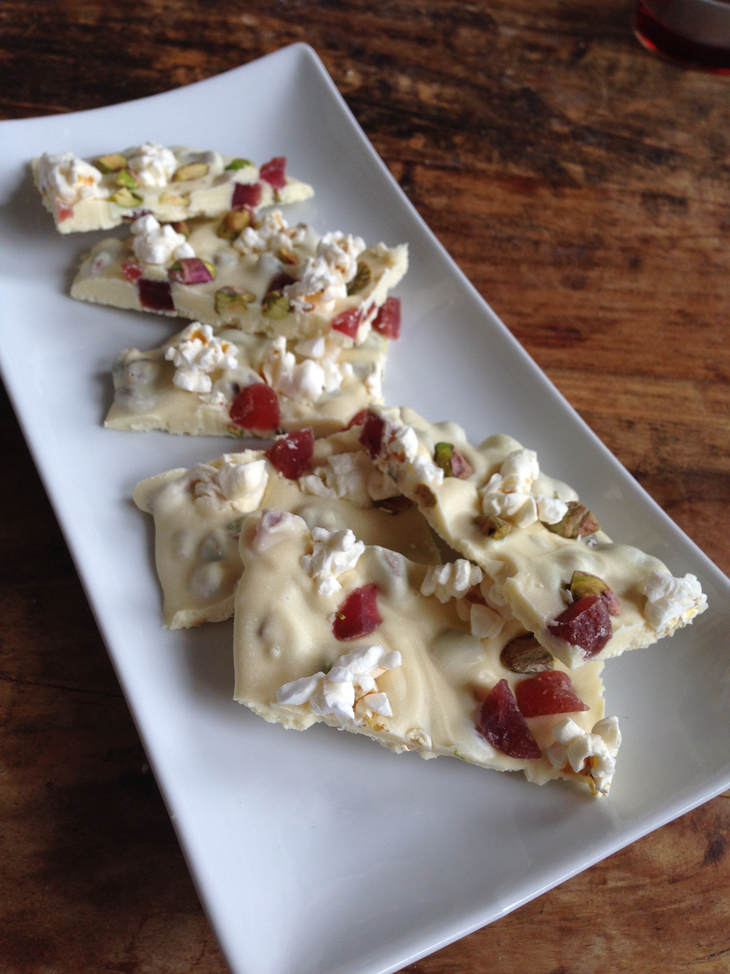 Witte chocoladereep met pistache, gedroogde aardbeien en popcorn